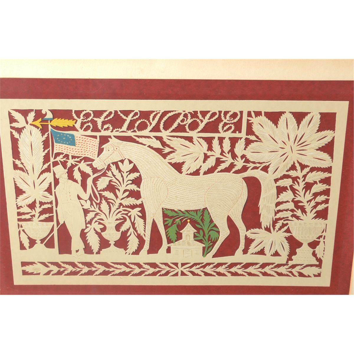 Depicting a man with his horse and an American flag, 10.25" H x 15.5" W sight, circa late17.5" H x 22" W framed early 20th century