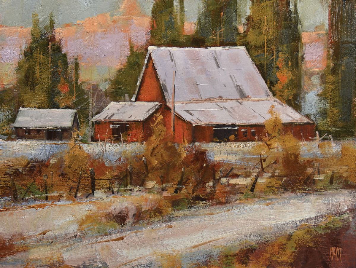 Artist: David W. Mayer. Title: A Little Morning Snow. Medium: Oil. Size: 12" x 16". Framed size (if applicable): 18" x 20" Artist's description: Winter comes gently to a Western ranch in the Rock Mountain high country. Shipping from ZIP CODE 80026.