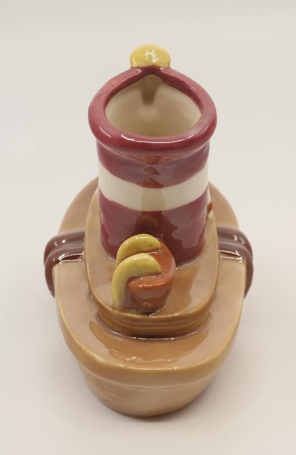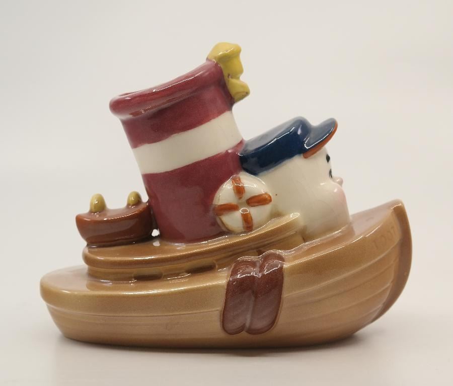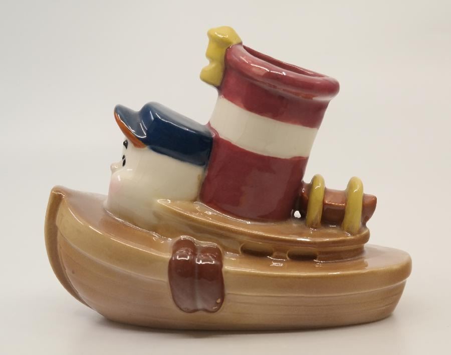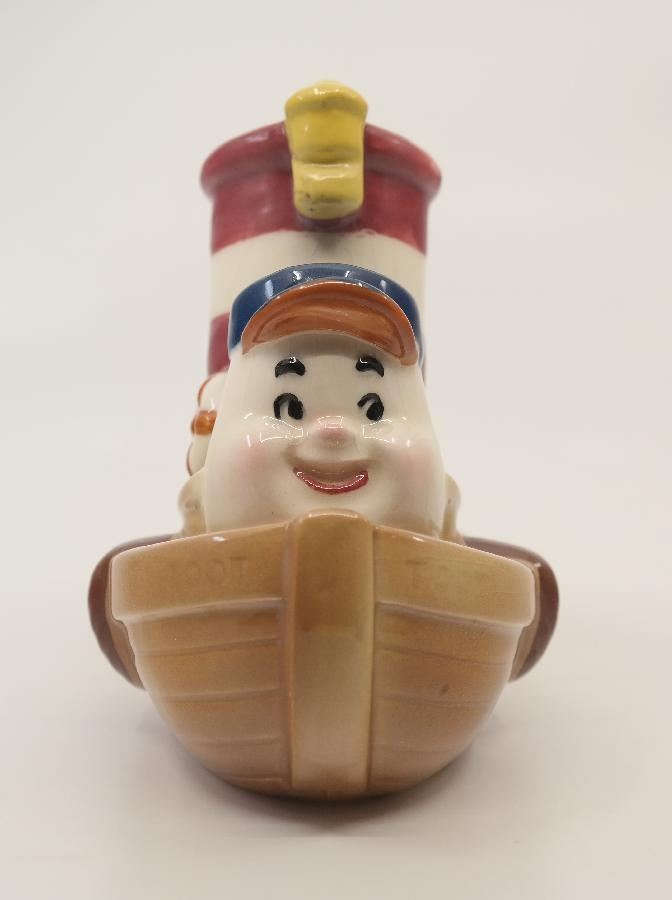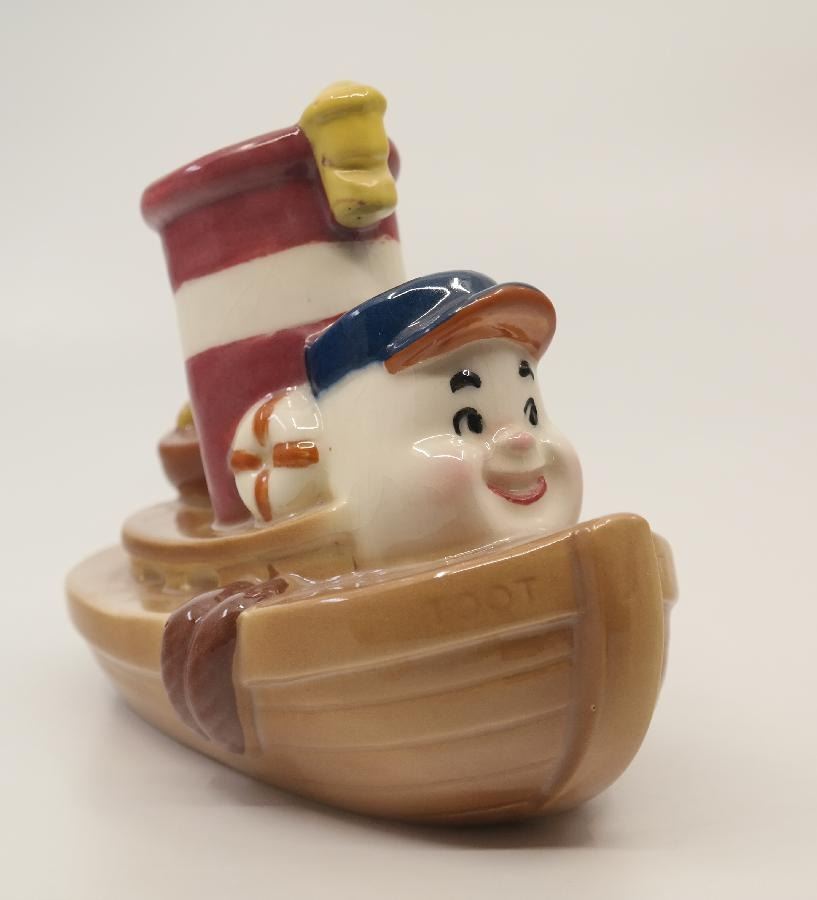 (Shaw, 1940s) A Little Toot ceramic planter by Evan K. Shaw Pottery. Considered one of the rarest of 1940s Disney Ceramics, the piece has an opening in the smokestack so it can be used as a planter. Measuring 5" x 3" and 6" tall, the figurine is in very good condition with minor handling wear.