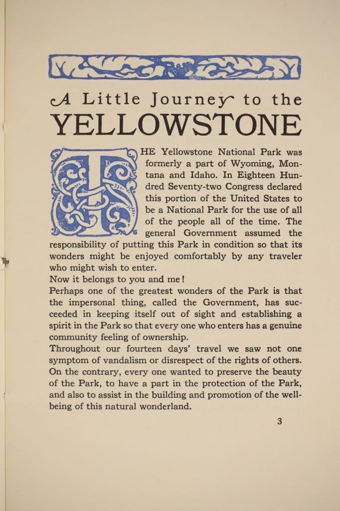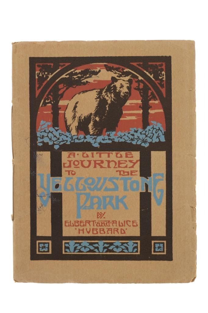 For your consideration is this souvenir booklet from Yellowstone National Park titled, "A Little Journey to the Yellowstone" by Elbert & Alice Hubbard circa 1915. The book features various black & white photos of famous locations around the park with included write-ups on the locations. The front paper cover shows a colored image of a large bear with some trees in the background. The title and author's names are written in red and blue lettering, while the back reads, "Fresh air is free - Why economize!" in black lettering and is surrounded by a floral border. The book shows good condition overall for its antique age with some wear to the corners and edges but no signs of obvious damage. The book measures 8" L x 6 1/16" W.