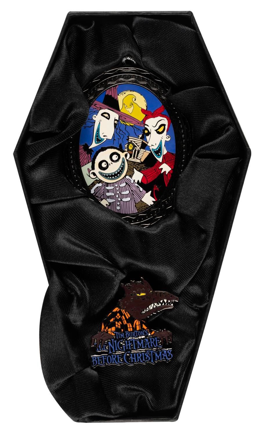 (Disneyland, 2004) A “Nightmare Before Christmas” Lock Shock and Barrel ornament and Werewolf pin set, released in a limited edition of 750 at Disneyland’s Haunted Mansion Holiday event on September 30, 2004. The set is in fine condition in the 4” x 7” coffin-shaped commemorative box.