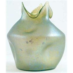 A Loetz style iridescent green glass vase, with violet splashes, hand-blown with pinched globular body, 7ins £120-180