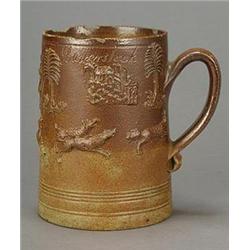 A London salt-glazed stoneware dated commemorative mug, applied with figures from a fox hunt, tre...