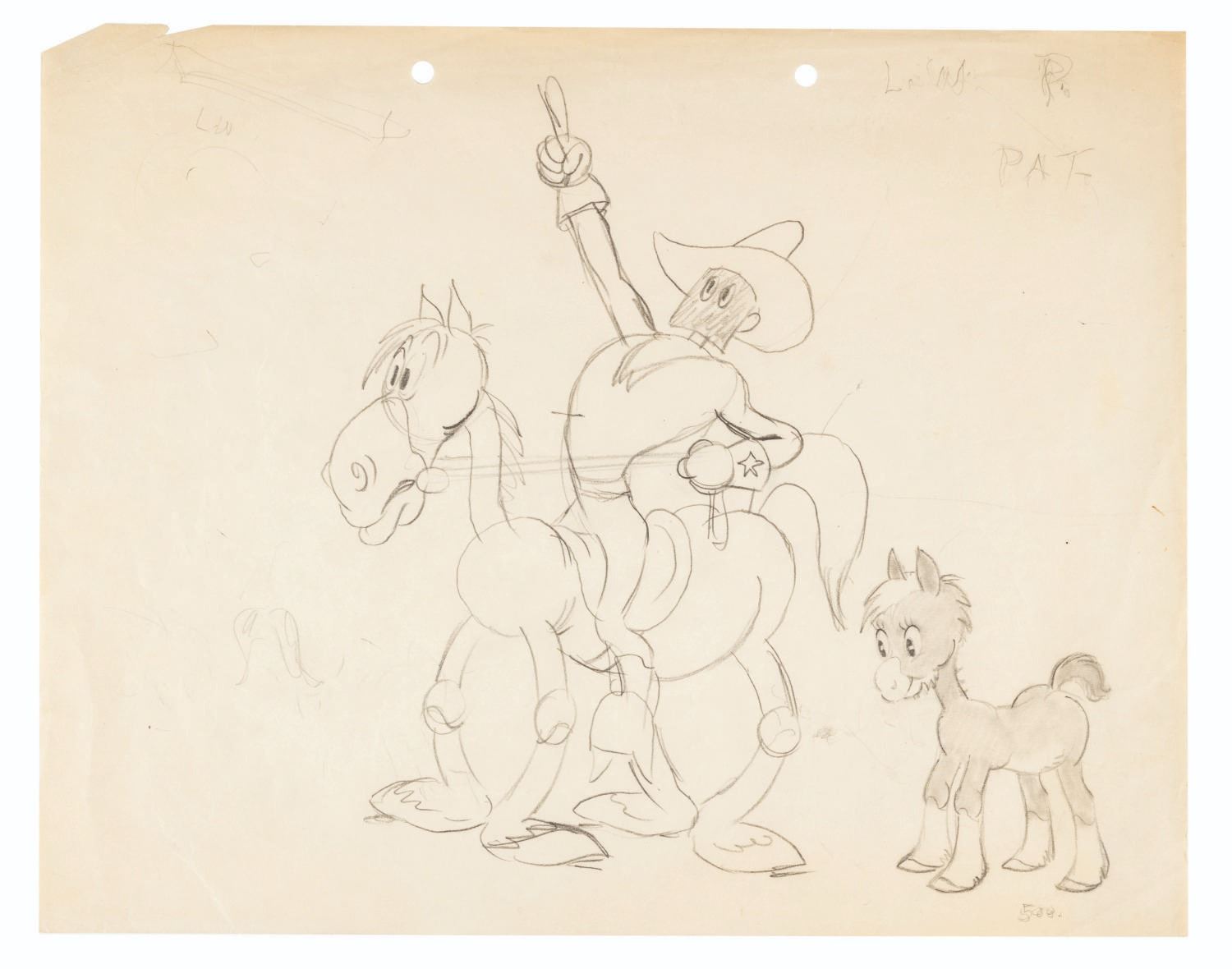 (Schlesinger, 1939) An original production drawing from “The Lone Stranger and Porky.” With an image size of 8.75” x 8.75” on 9.5” x 12” animation paper, the graphite drawing is in good condition with creases, edge wear, tears, and a fold at the top left corner.