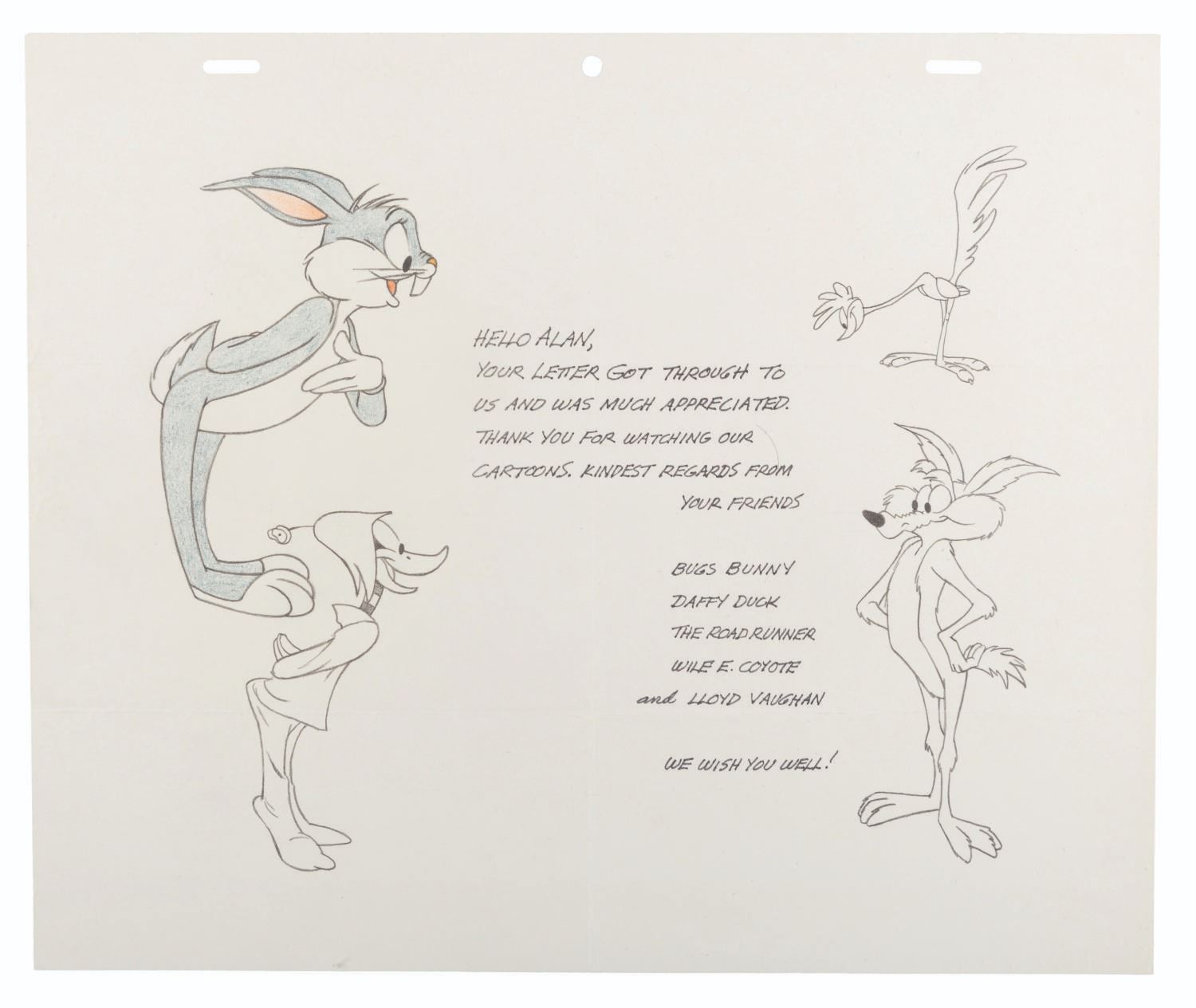 (Vaughan, 1970s-80s) A drawing of Bugs Bunny, Daffy Duck, Wile E. Coyote, and the Road Runner from Warner Bros. Looney Tunes by animator Lloyd Vaughan, signed with a note and dedication to Alan Hylton. Vaughan is well known for his prolific work on the Merrie Melodies and Looney Tunes series on shorts like "Wackiki Wabbit," "Hair-Raising Hare," "Duck Dodgers in the 24 1/2th Century," and more. Accomplished in pencils, the drawing on 10.5" x 12.5" animation paper is in very good condition with slight color shift to the paper from age.