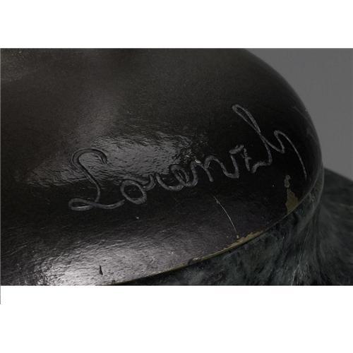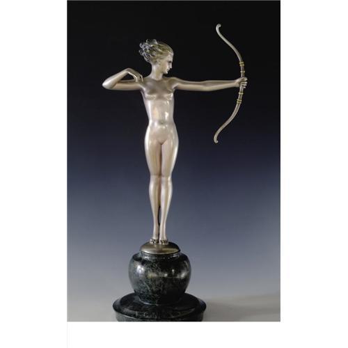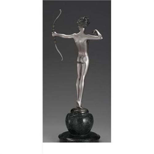 <B>An Austrian Art Deco Silvered Bronze Figure: <I>Diana</B></I></B></I><BR><BR>Josef Lorenzl (1892-1950), Austria<BR>Circa 1920-30<BR>Silvered and cold painted bronze, marble<BR>Signed: <I>Lorenzl</B></I><BR>24 in. high<BR><BR>A silvered bronze figure of Diana, with outstretched left arm holding a bow, her right hand recoiled, on shaped green marble base.<BR>