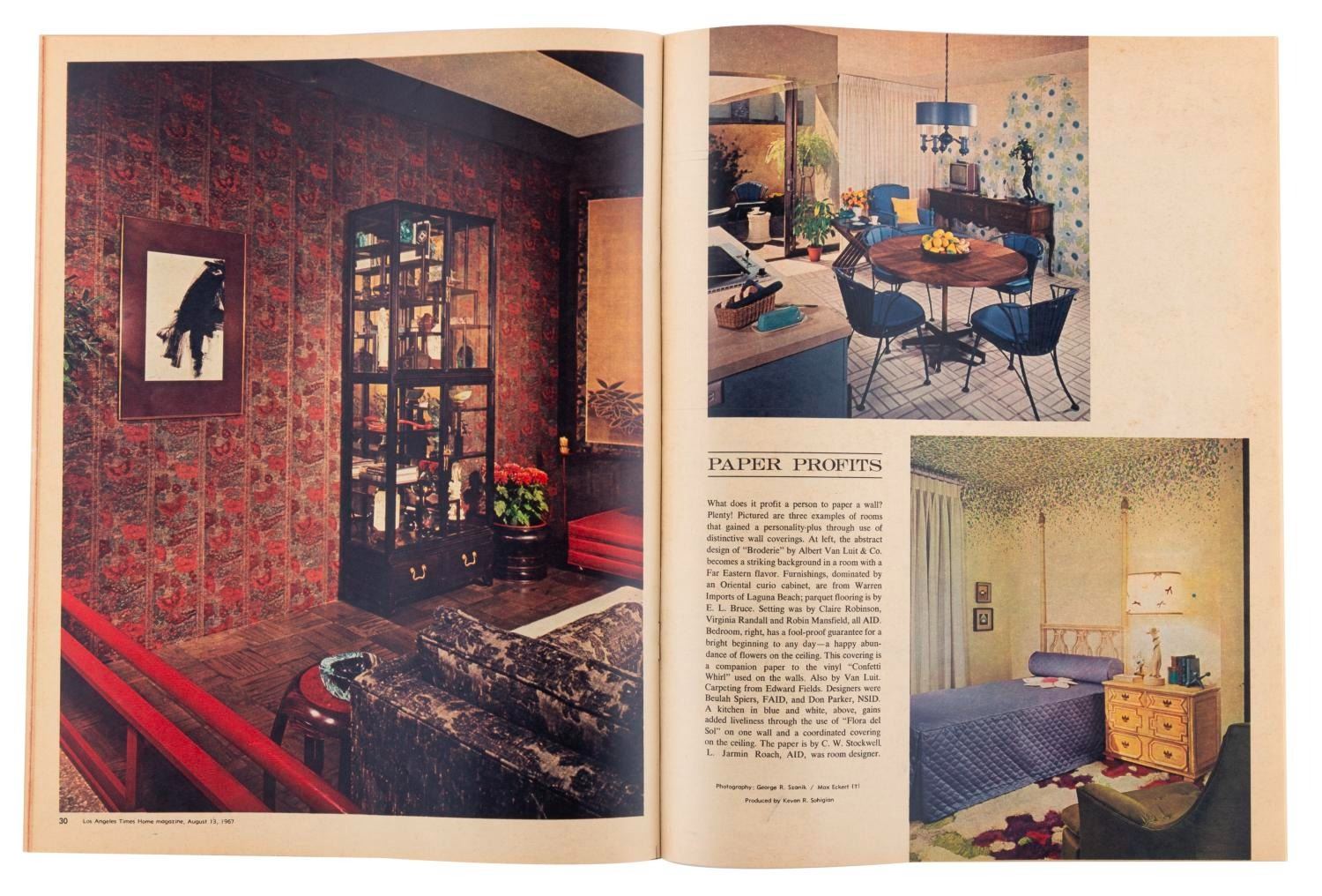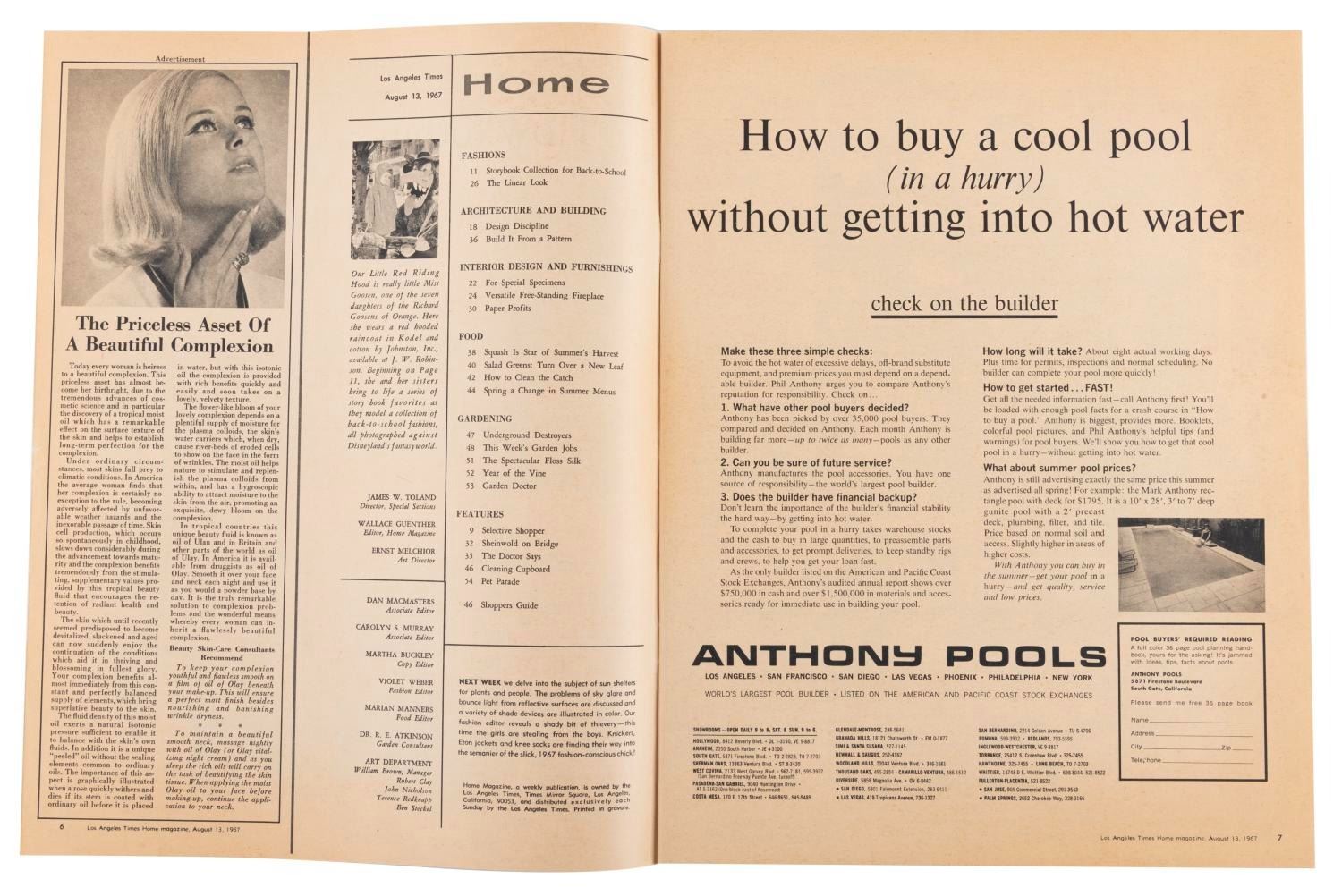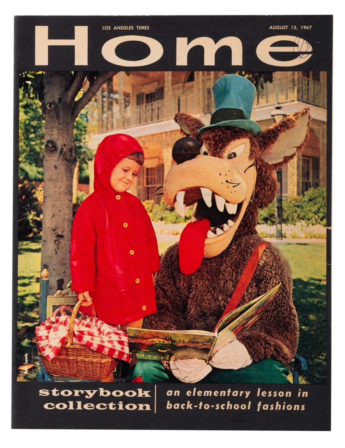(Los Angeles Times, 1967) An August 13, 1967, issue of Home Magazine featuring the Big Bad Wolf walk-around character on the cover and photos inside of children exploring Disneyland wearing the latest fashion. Measuring 10.25" x 13.25", the magazine is in very good condition with handling wear, discoloration from age, scratches on the cover, and an ink inscription at the top right.