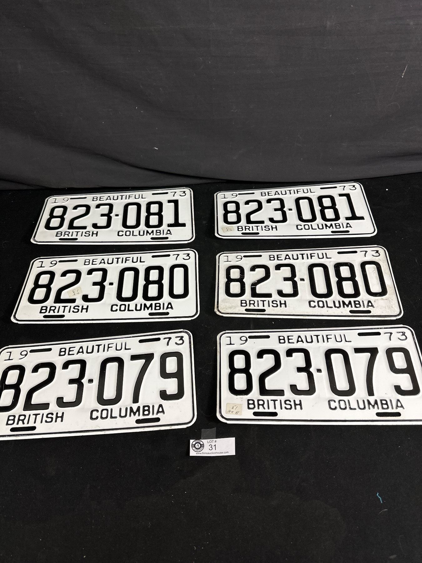 A Lot Of 3 1973 in Sequence BC Licence Plates In Pairs Never Used