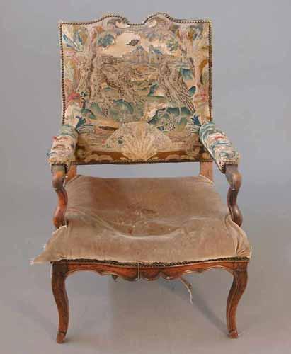 A Louis XIV walnut fauteuil, the square shaped back retaining early 18th century gros and petit point tapestry, on cabriole legs £600-800