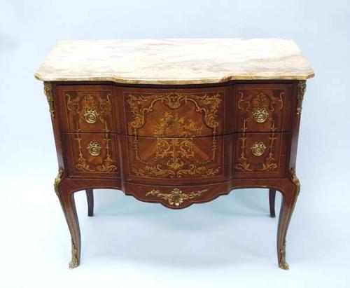 A Louis XV style petit commode. Fitted with three small drawers with floral marquetry decoration. Shaped veined marble top. 35" long, 15 1/2" wide, 32" high. 1500-2000