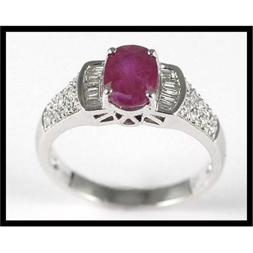 This pretty 18K white gold ring contains with an oval shape ruby set in the center weighing approximately 1.65 carats. It measures in 5/16 inches long by 1/4 inches wide. 10 tapered baguette diamonds are set on the side with an estimated total weight of 0.20 carats. There are also 20 pieces of round diamonds set on this ring weighing approximately 0.15 carats. This sparkle ring weights 3.50 grams and is in size 7.