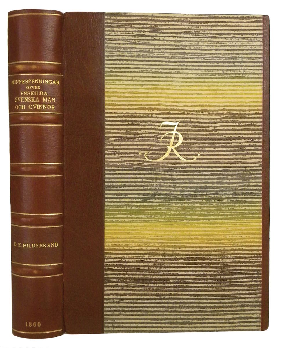 Hildebrand, Bror Emil. MINNESPENNINGAR ÖFVER ENSKILDA SVENSKA MÄN OCH QVINNOR. Stockholm, 1860. 8vo, attractively bound in brown levant half morocco with decorative sides; spine with five raised bands, ruled and lettered in gilt; top page edges gilt; gilt monogram of René Jensen Christianson on upper cover. xii, 454 pages; 21 folding lithographic plates of medals. Occasional text underlining and penciled Oldenburgs auktionspriser. Fine. See catalogue for full description.