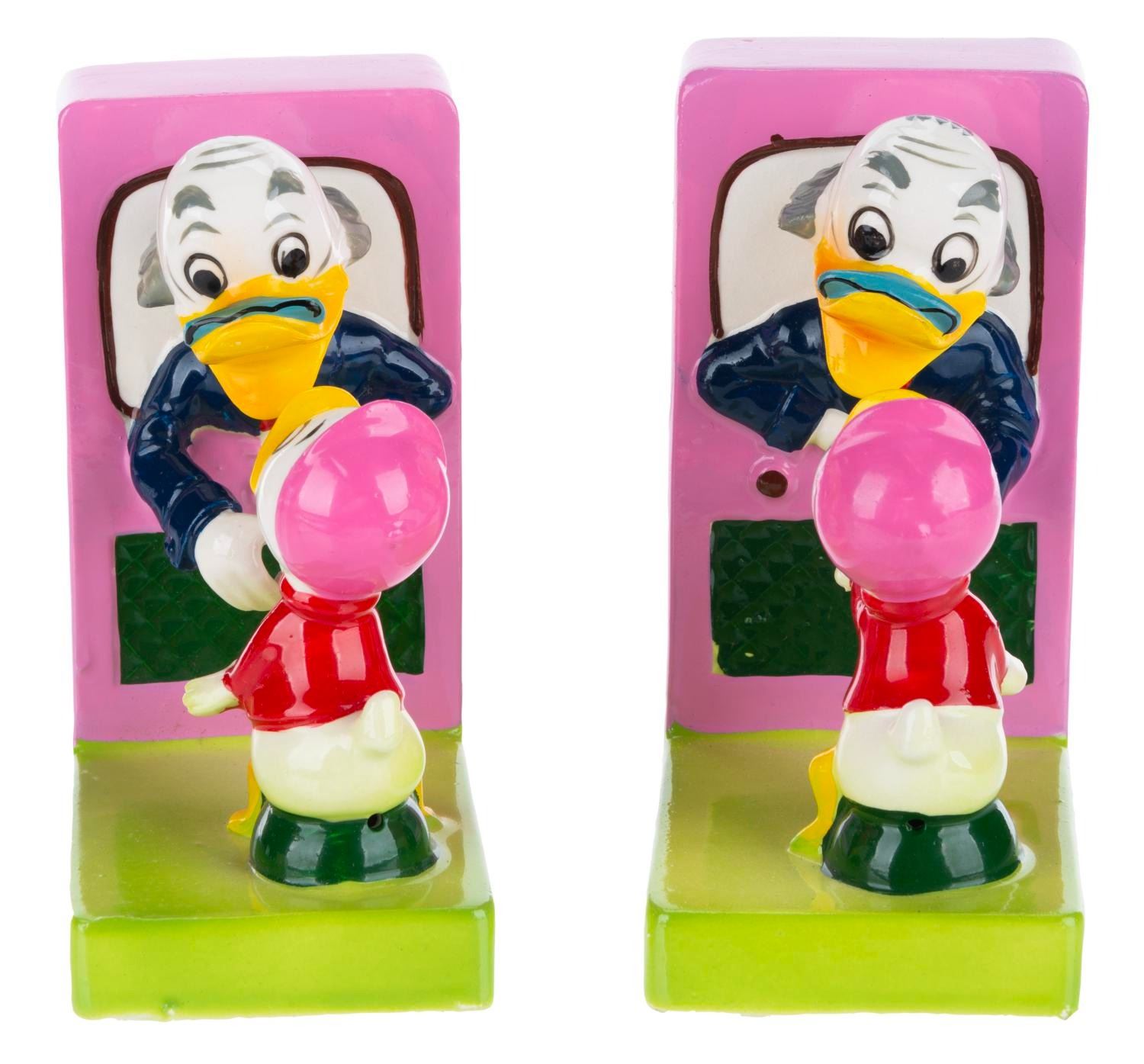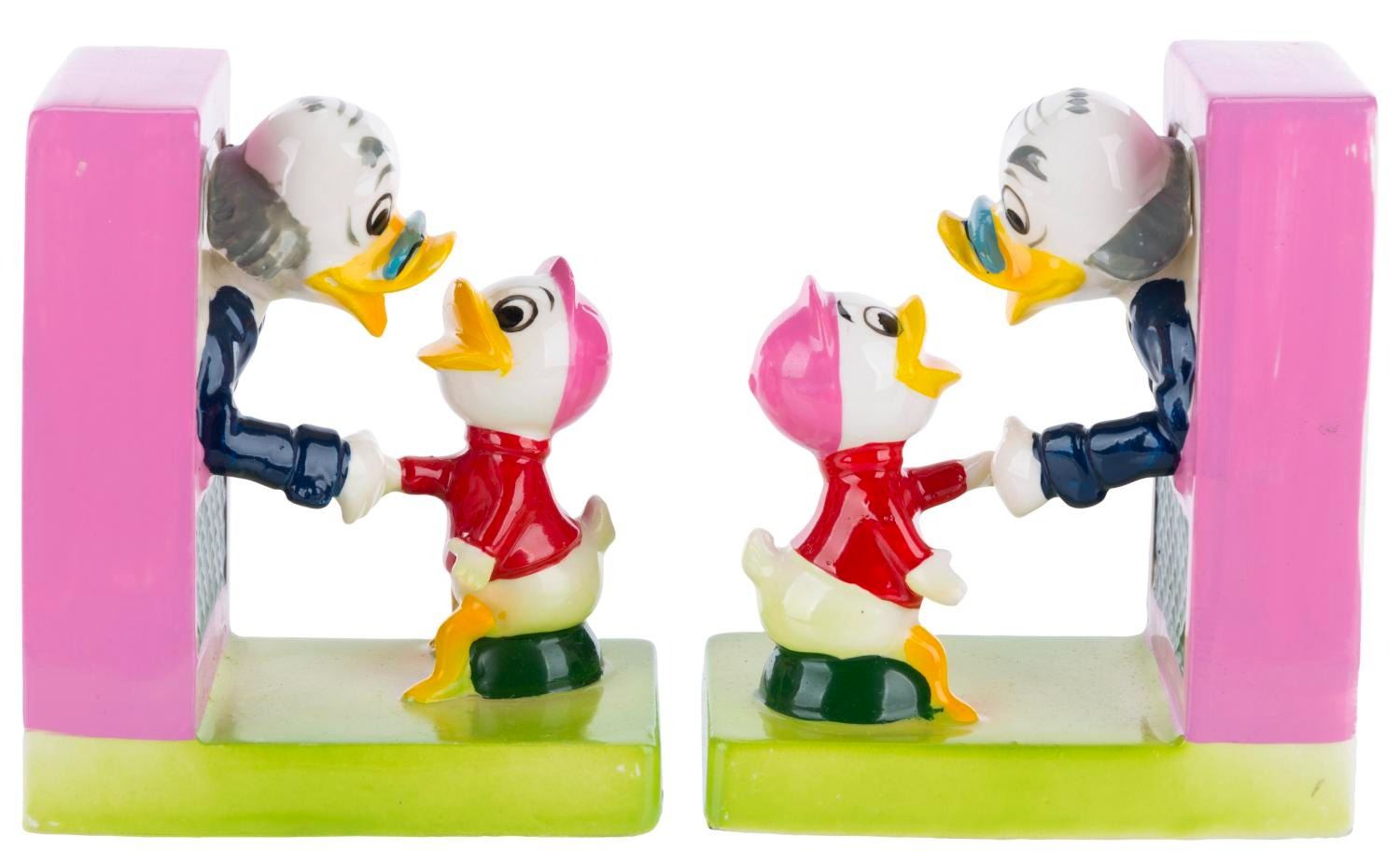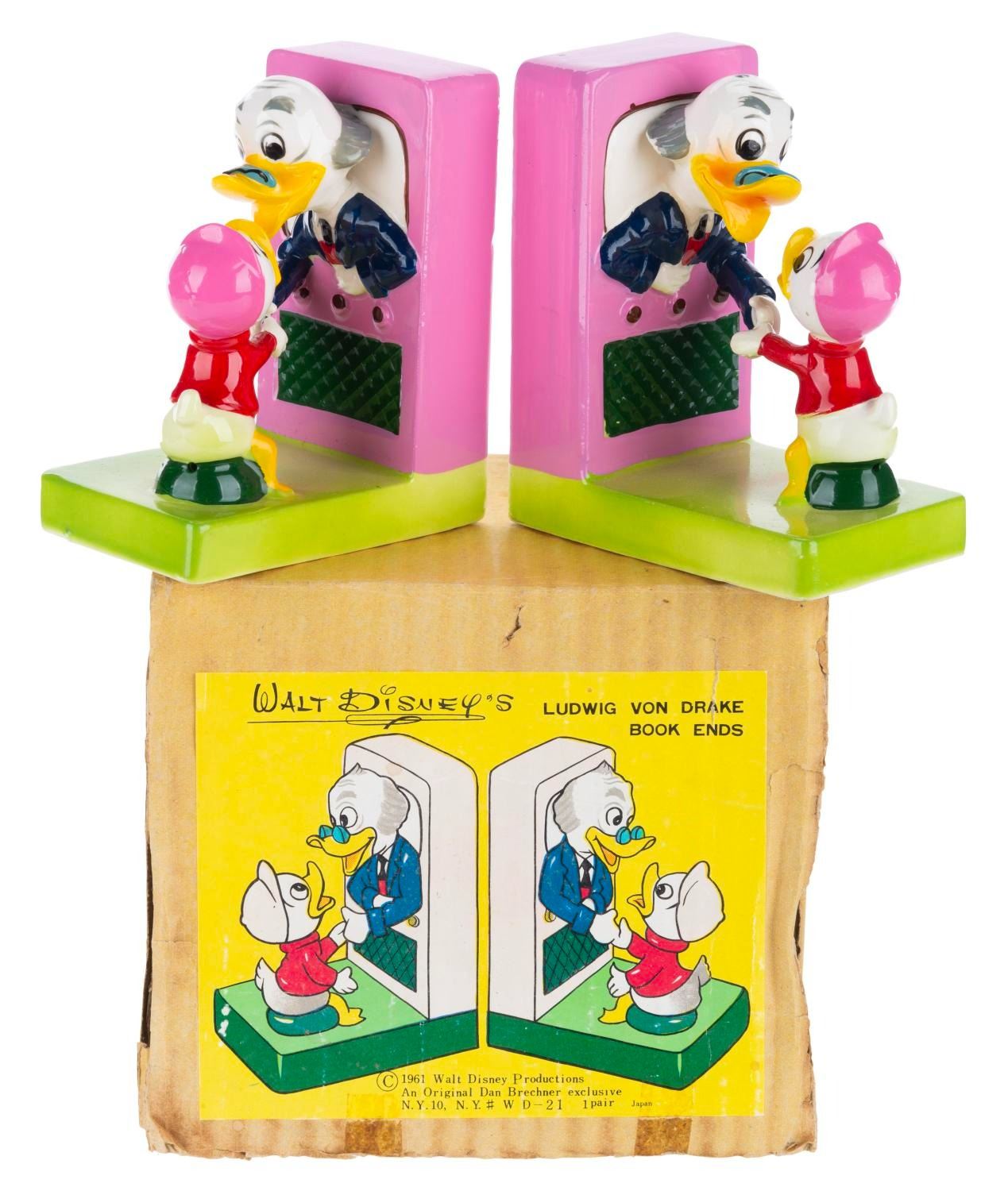 (Dan Brechner, 1961) A Dan Brechner exclusive Walt Disney's Ludwig Von Drake Book Ends set with the original box, released to coincide with the debut of "Walt Disney's Wonderful World of Color." Measuring 2.5” x 4.5” x 3.75” each in the original 5.75” x 6.25” x 4.5” tall box, the ceramic book ends are in good condition with crazing throughout, scuffs, and a thin crack on one of Ludwig’s necks from a previous repair.