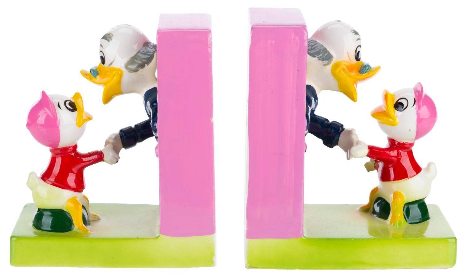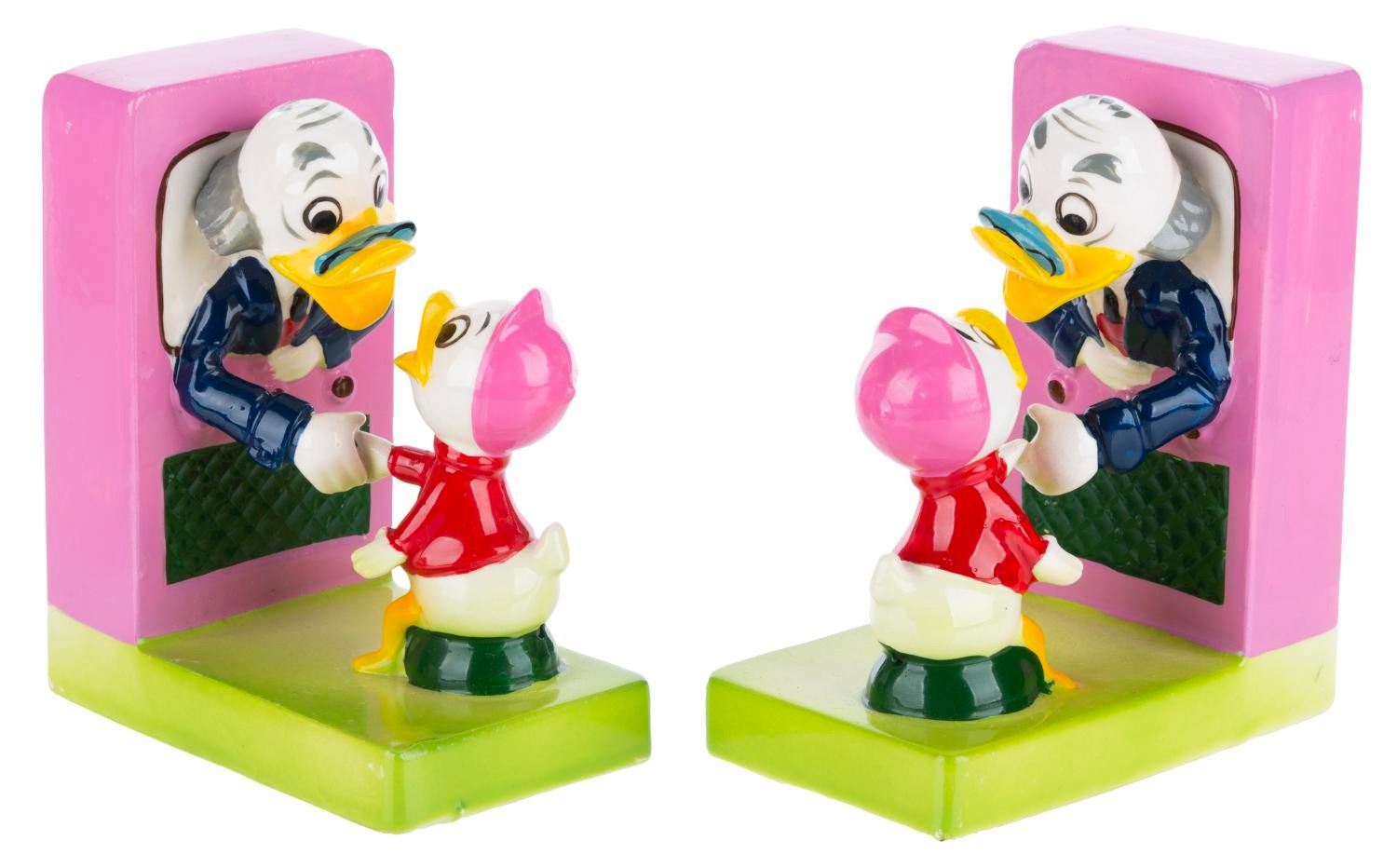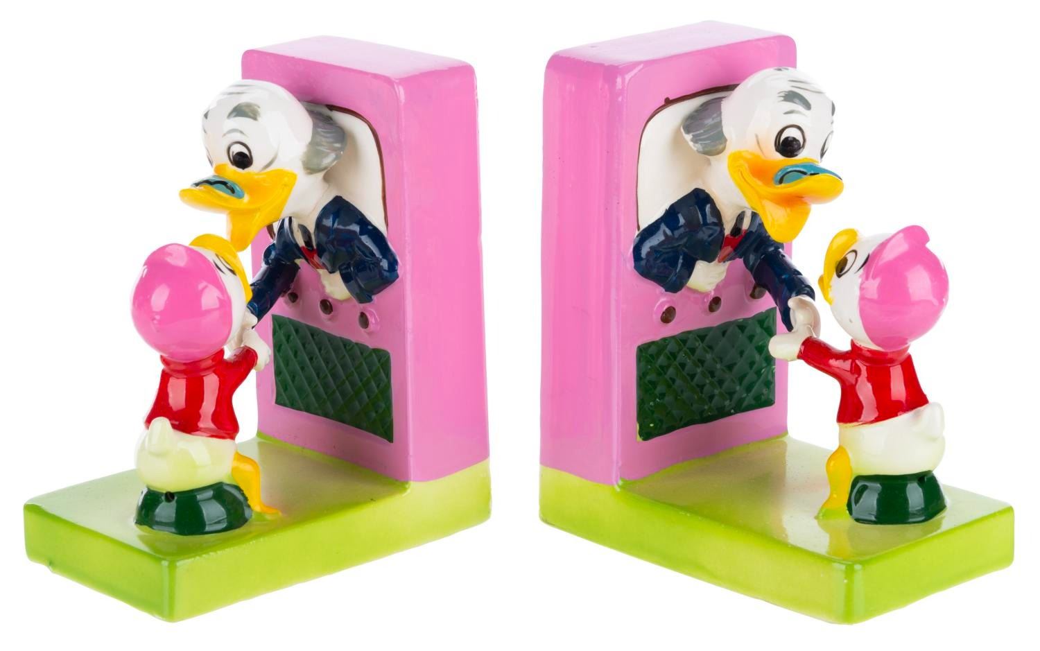 (Dan Brechner, 1961) A Dan Brechner exclusive Walt Disney's Ludwig Von Drake Book Ends set with the original box, released to coincide with the debut of "Walt Disney's Wonderful World of Color." Measuring 2.5” x 4.5” x 3.75” each in the original 5.75” x 6.25” x 4.5” tall box, the ceramic book ends are in good condition with crazing throughout, scuffs, and a thin crack on one of Ludwig’s necks from a previous repair.