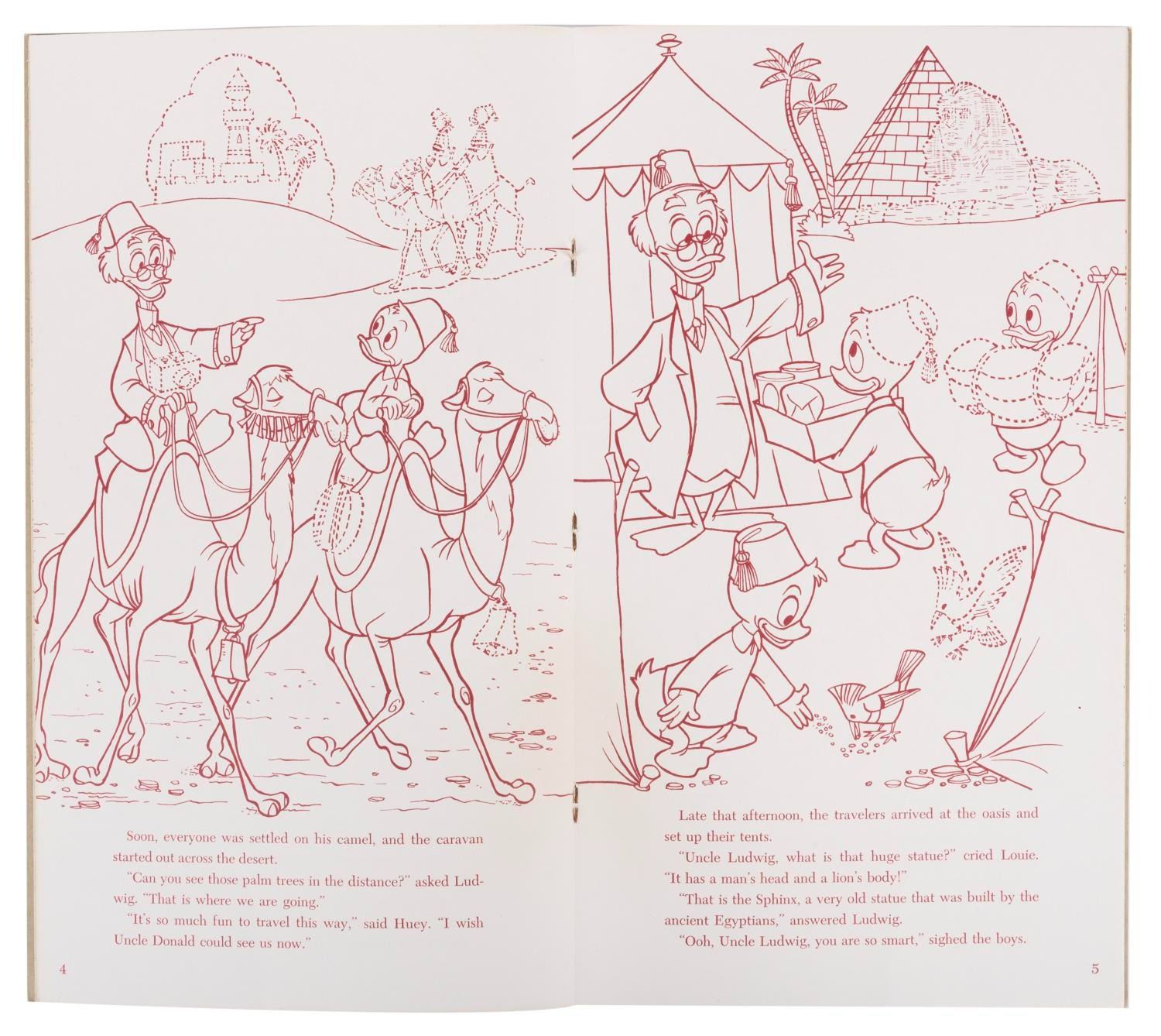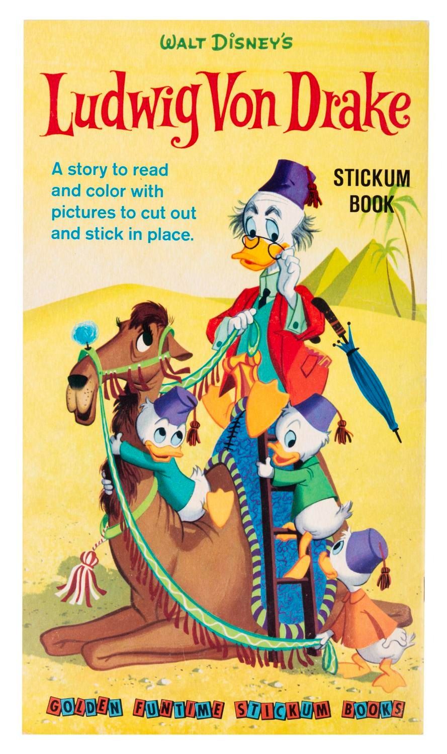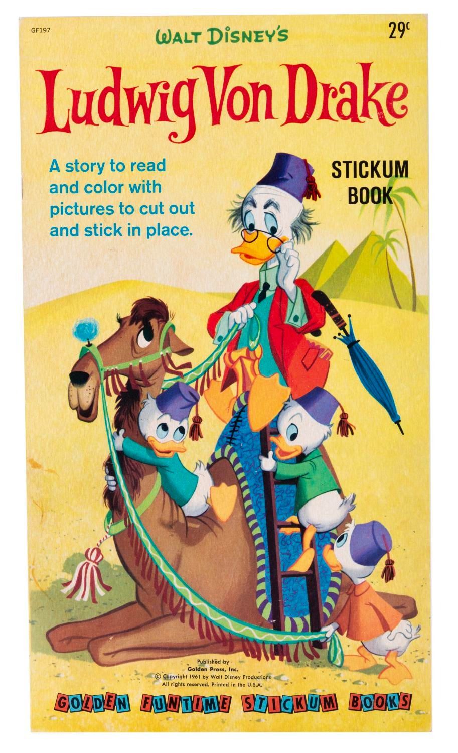 (Disney, 1961) A Walt Disney’s Ludwig Von Drake Stickum book. The eight-page book contains two pages of stickers intended to be cut out and applied to the pictures throughout. Measuring 7.5" x 13", the book is in very good condition with very slight edge wear, soiling to the cover, and light creasing.
