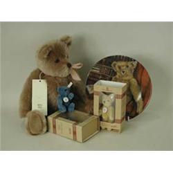 A Lyle 'Big Softie' traditional style teddy bear, 35cm high, two boxed Steiffclub miniature bears, and a Steiff club collectors plate. 20cm diameter Est.60/80