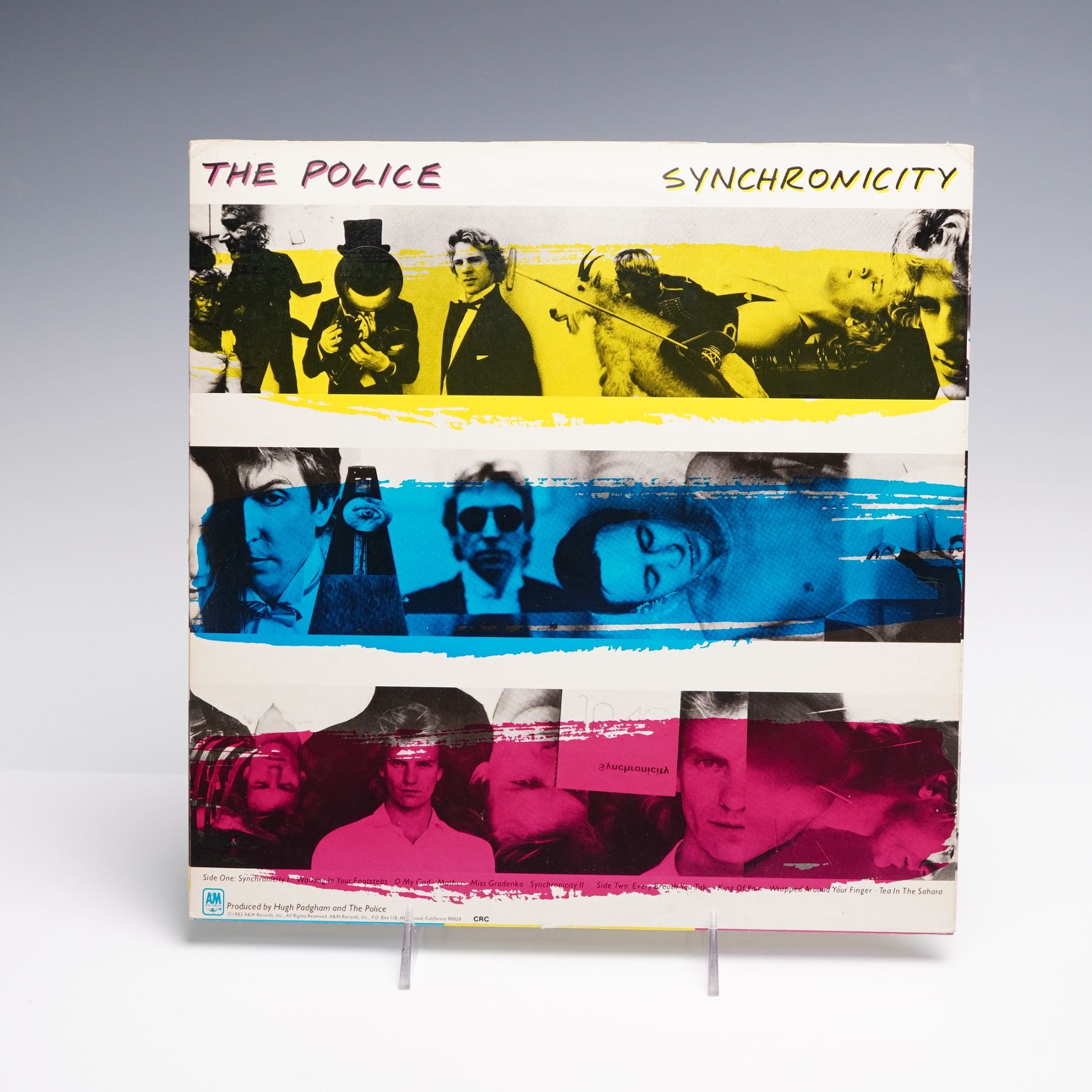 This 12-inch stereo vinyl LP features Synchronicity, the 1983 studio album by British rock band The Police, released under A&M Records. The album is structured into two sides, with Side One including tracks such as "Synchronicity I," "Walking in Your Footsteps," "O My God," "Mother," and "Miss Gradenko," while Side Two continues with "Synchronicity II," "Every Breath You Take," "King of Pain," "Wrapped Around Your Finger," and "Tea in the Sahara." The outer sleeve is adorned with a striking tri-color photo collage design using alternating strips of blue, red, and yellow layered over black-and-white images of the band, a visual motif echoed on the center record label. The back cover continues this aesthetic with further color-striped photographic strips and the full track listing. The record label at the vinyl's center mirrors the artwork's bold palette, printed with all song titles and production credits. The album was co-produced by Hugh Padgham and The Police.