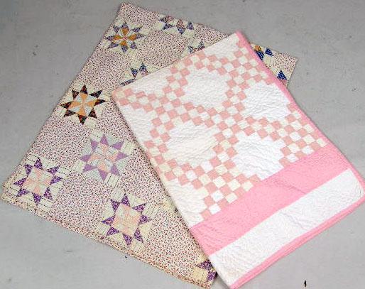 Multicolor star motif. Together with a hand-stitched pieced rayon quilt with pink and white square motif. 2 pieces. 72"h x 86"w and 53"h x 74"w Wear and stains.