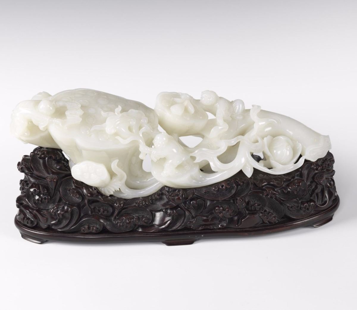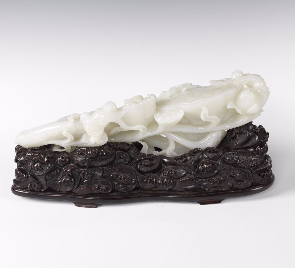 A Fine Hetian White Jade carved large blossomsing lotus flowers with vine sprays and auspicious symbols of fortune, cradled on a zitan wooden base with complementary floral detailing, 20th century, weighing approximately 15 pounds. Length 15"
