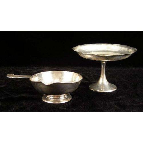 A MANCHESTER STERLING SILVER FOOTED SHAPED CIRCULAR COMPOTE WITH A JENNINGS SILVER COMPANY, IRVINGTON, NJ HANDLED GRAVY BOAT<BR><BR>Compote 6-1/4"diameter, gravy, 7" long over handle, total weight apx. 9 T.O.