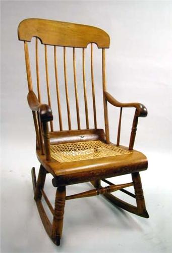 A MAPLE, PINE, AND BEECHWOOD CANED SEAT ROCKING CHAIR; American, the shaped crest above seven spindles, with downswept arms centering a caned seat and ending on rockers (losses to caned seat) 42 1/2"h