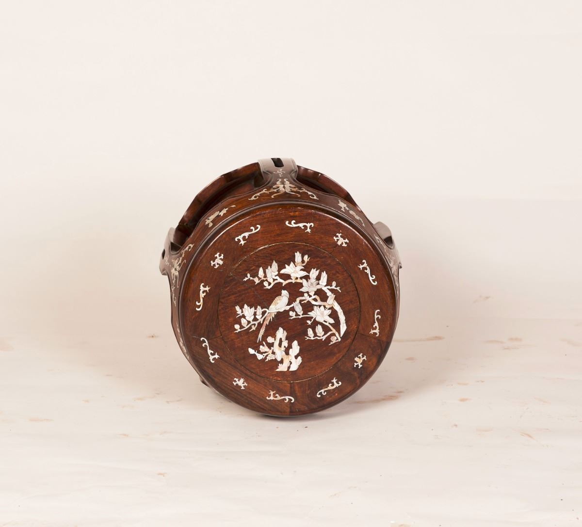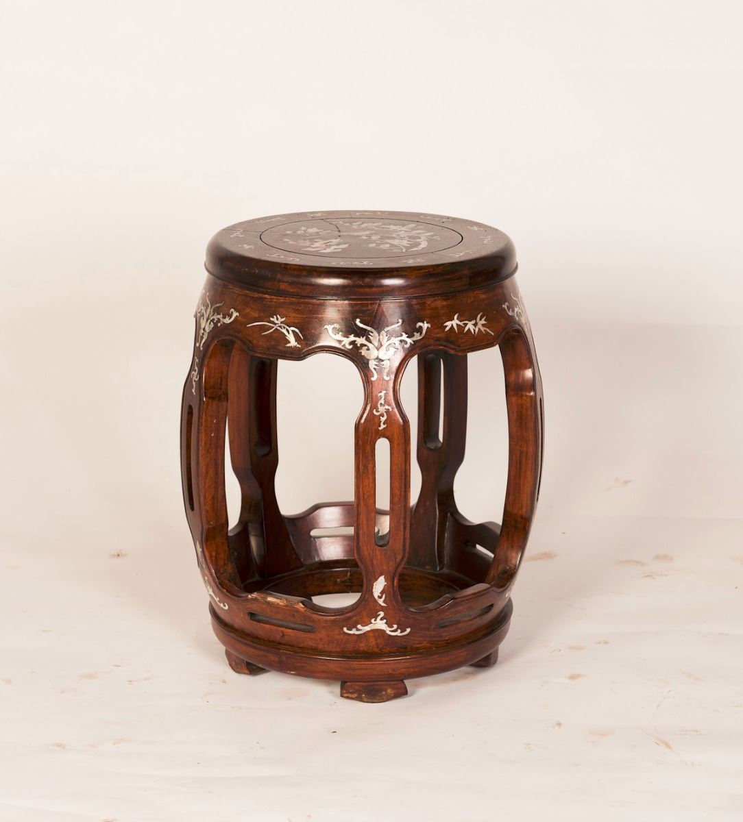 A single board top drum chair with floral marble inlay on the top board, apron and stretcher. Diameter 12.5" Height 18"