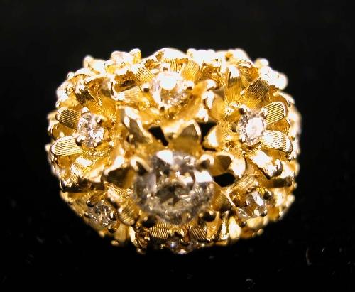 A MARIANNE OSTIER YELLOW GOLD AND DIAMOND FLORA-FORM COCKTAIL RING; The center flower, with diamond (apx. .75 ct.), surrounded by twenty diamond centered flowers, apx. 1.03ct., in the original fitted box