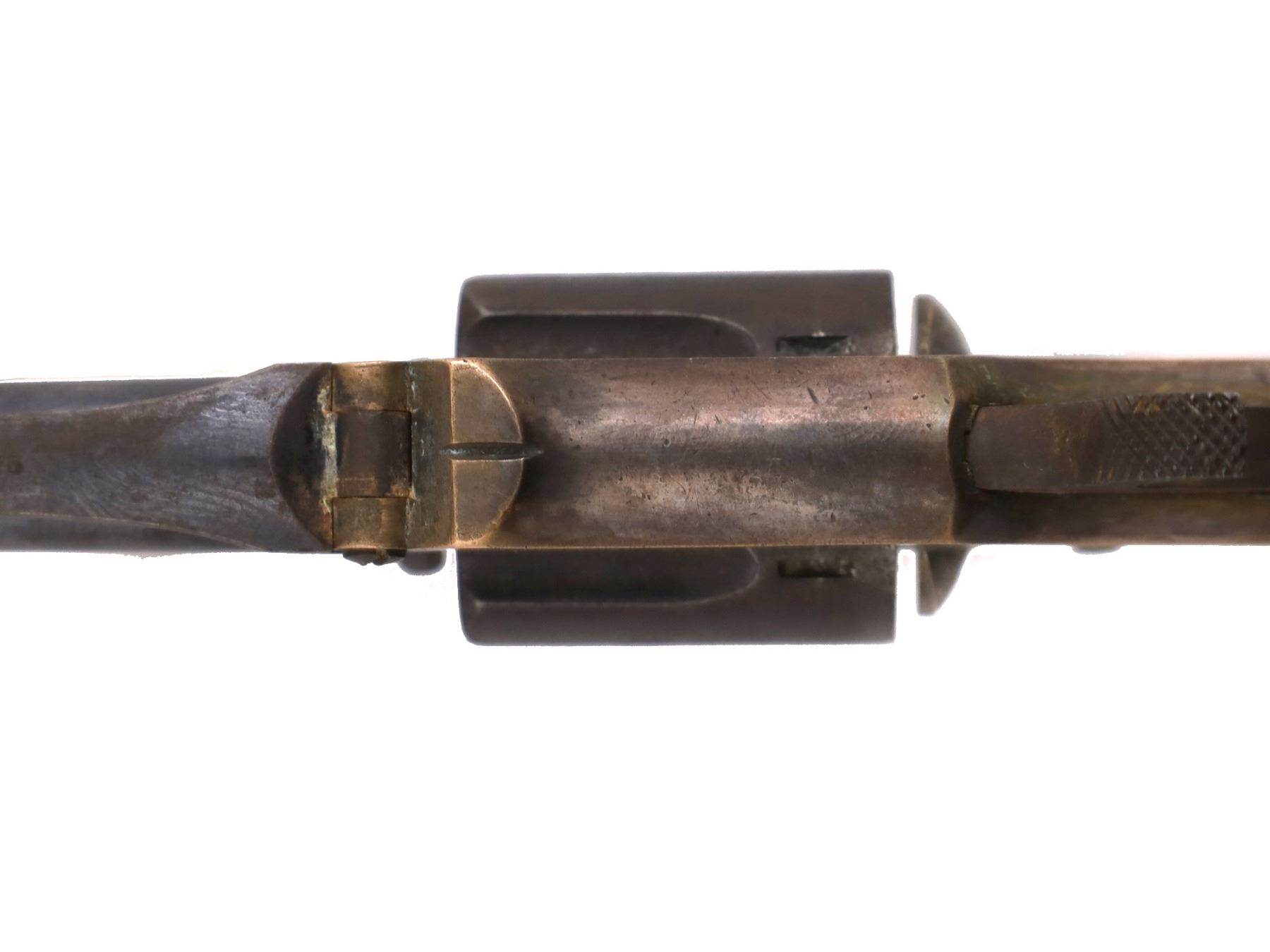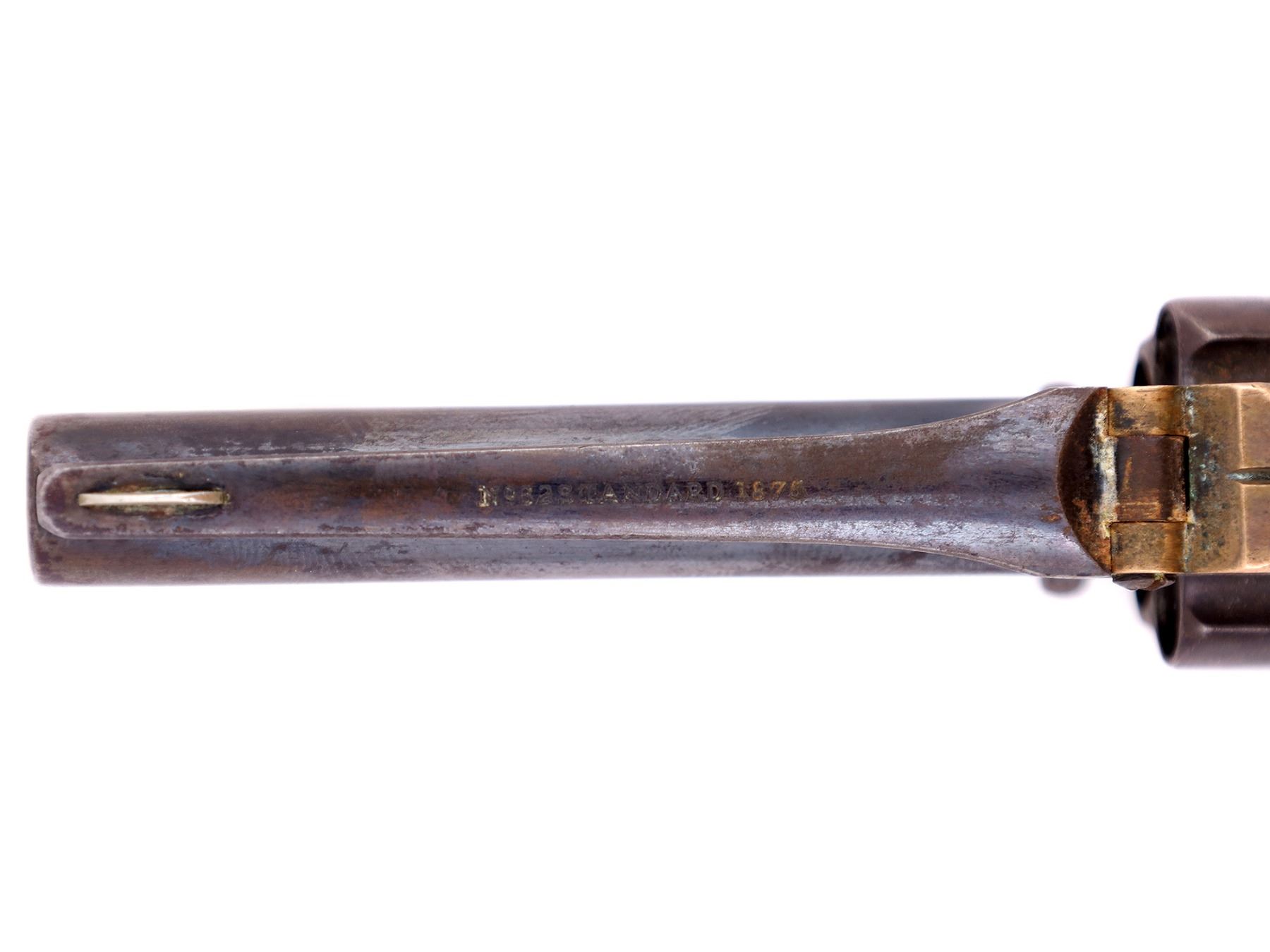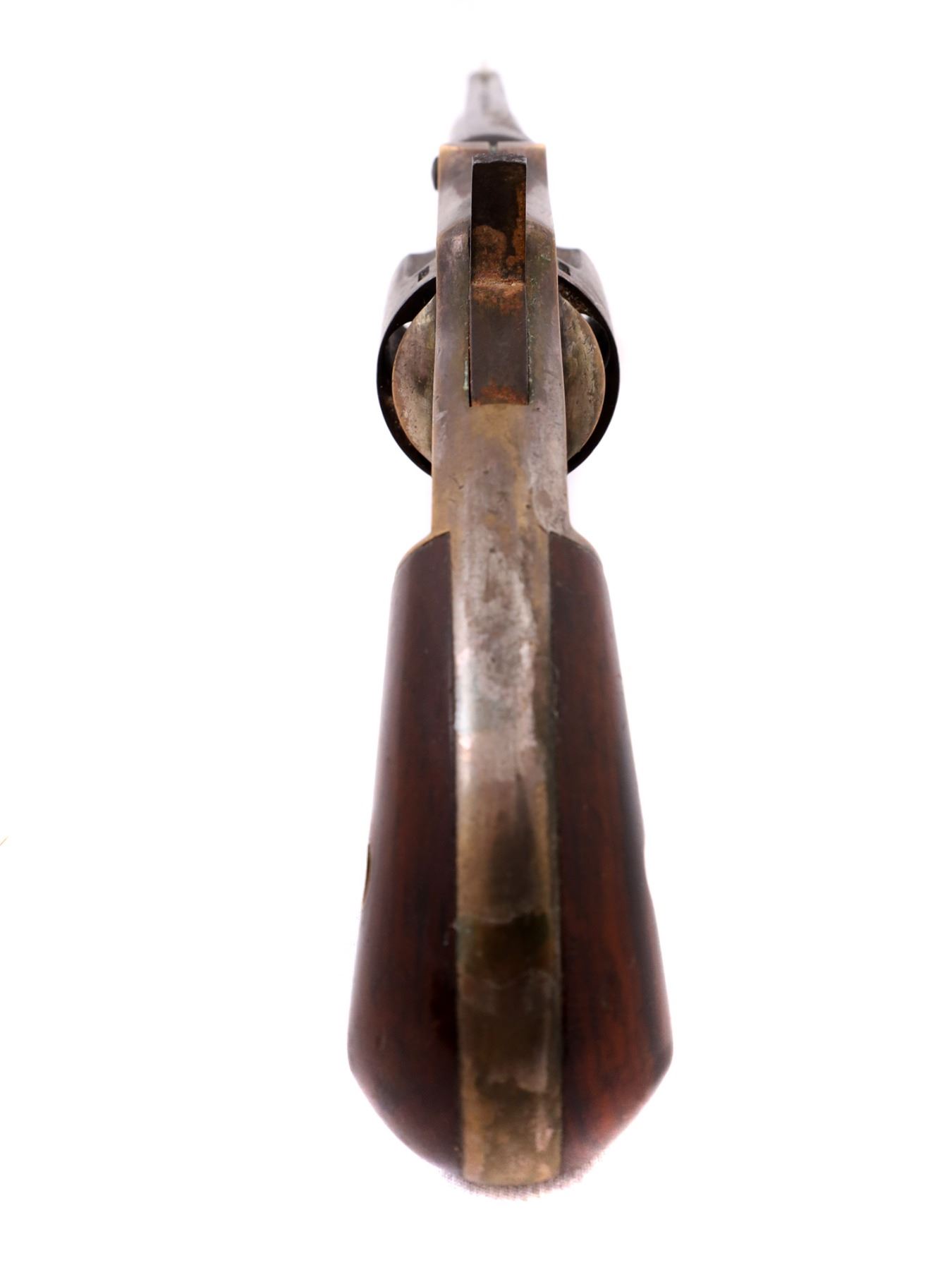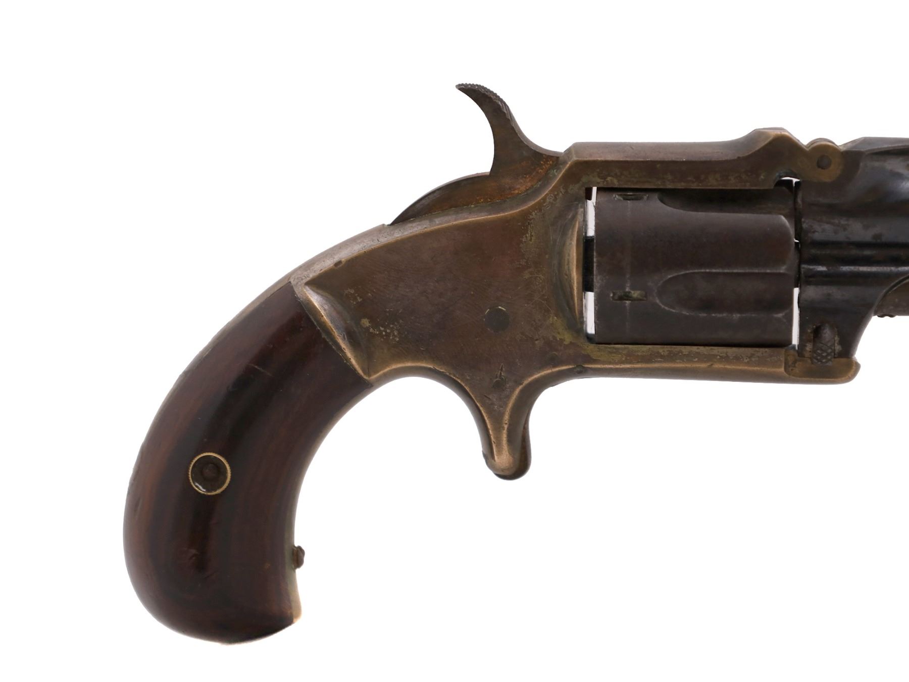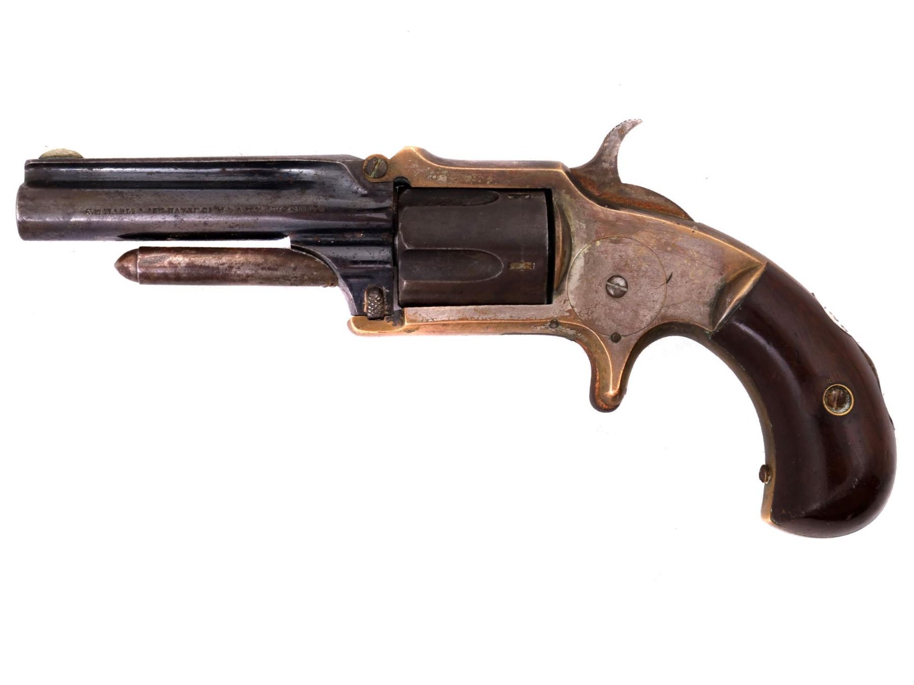 Marlin No. 32 Standard 1875 Single Action Revolver, .32 rimfire caliber, 3-inch blued barrel with fixed front and rear sights. Blued and nickel-plated finish. Marlin address and patent date to left side of the barrel. Spur trigger. Smooth hardwood bird's head grips. Good action.