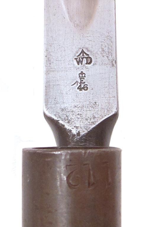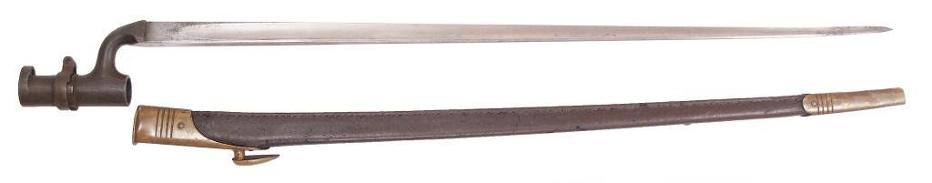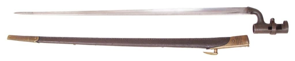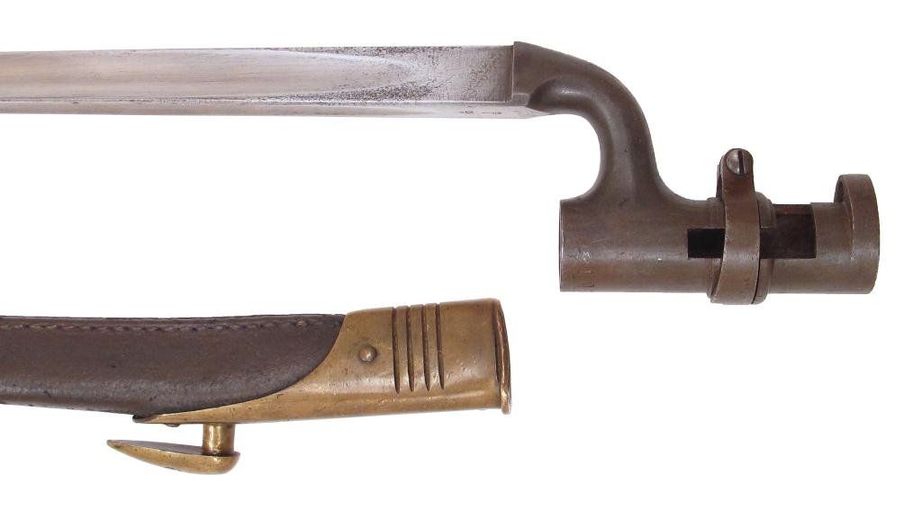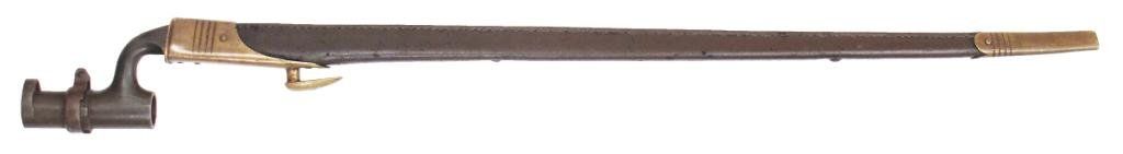 With integral socket struck 112 and locking ring, the fullered, triangular-section blade with original finish bearing ordnance marks WD and a crowned E over 46, each with the broad arrow stamp. In its leather scabbard with brass chape and locket marked 64. Latter 19th century.Overall length 64.3 cm. Condition I