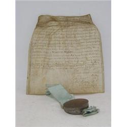A MASONIC DIPLOMA, 1801, Banff lodge, Alexander Fraser to be Master Mason dated 10th January, engrossed on apron shaped parchment, seal (cracked) in tinned skippet, 20cm x 18cm 80-120