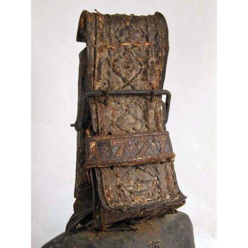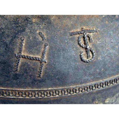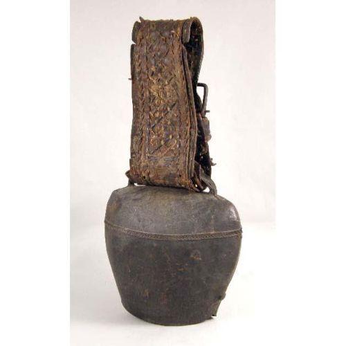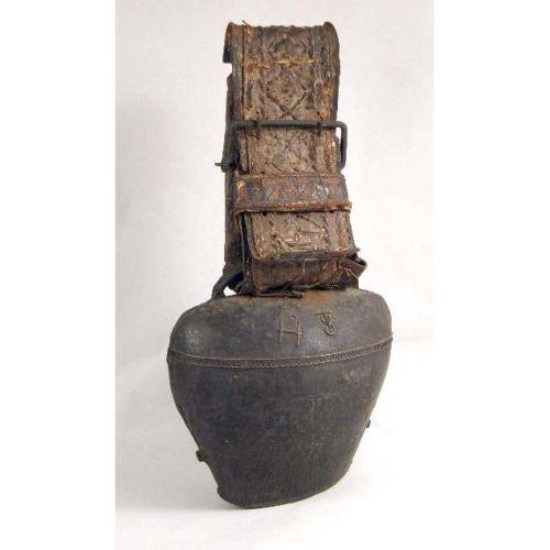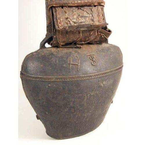 A MASSIVE SWISS "HOCH ALM" COW BELL<BR><BR>18th/19th century, with the applied initials HTS. Still having the original leather strap and buckle. With strap 24" h x 11" w.