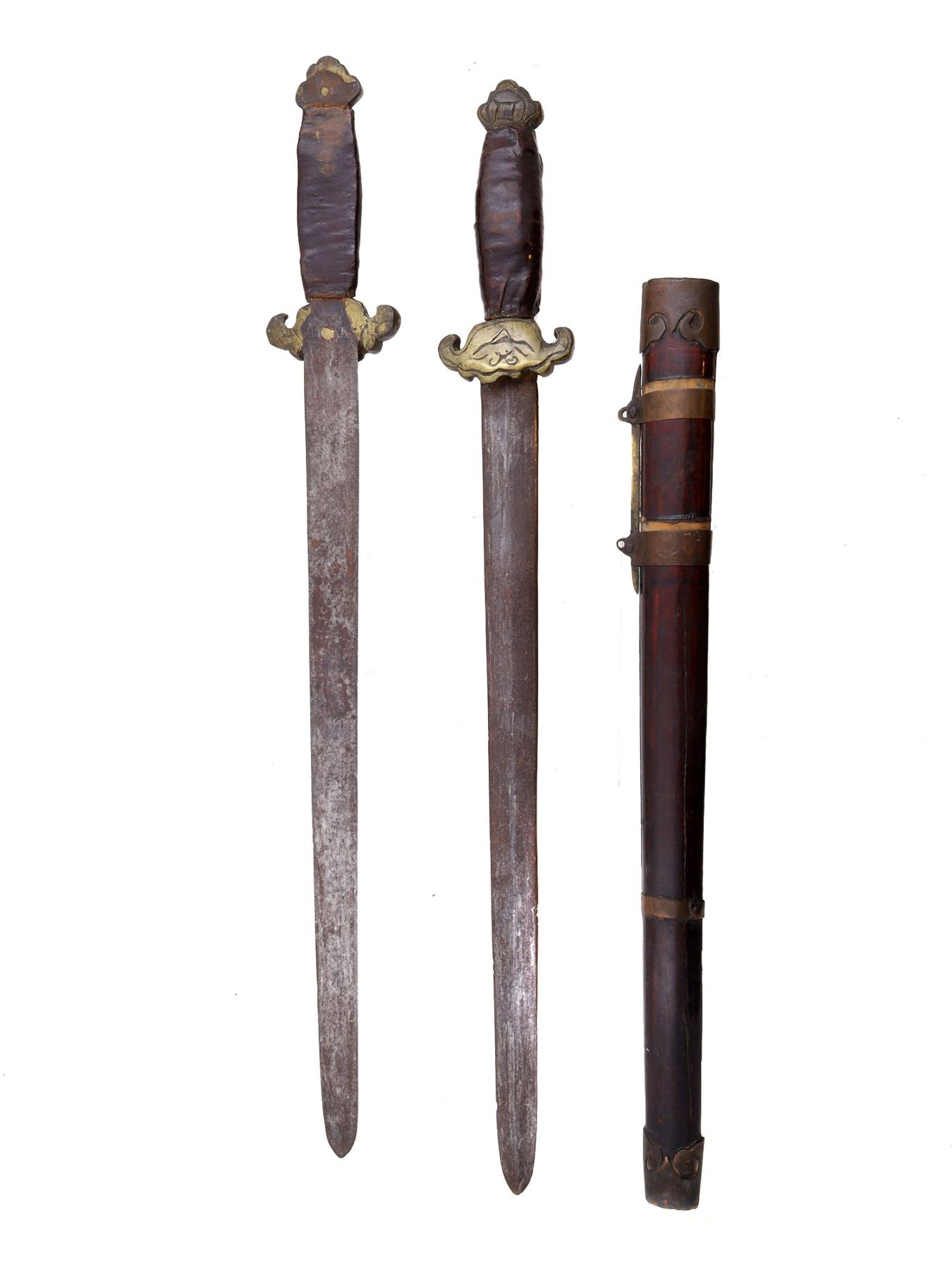 A matching pair of Chinese jian swords held in a single scabbard. The swords are detailed only on the outwardly facing side, while the reverse lacks shape and decoration. For instance, each sword blade is beveled on one side, and flat on the other. The brass guards are engraved with what appears to be a depiction of a moth on one side, but there is no guard on the other side of the blade. Because of these things, it appears that the reverse side of the blades is not meant to be seen. The handle is wrapped in leather with a red lacquer over it, and is finished with a brass pommel, similarly decorated on the front only. The scabbard has brass fittings along its entire length, with three simply engraved bands in addition to the locket and chape.