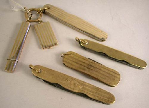 A MATCHING ROSE AND WHITE GOLD SHEATHED STRIPED PEN KNIFE, PENCIL CASE AND FOLDING CIGAR CUTTER; Together with 14K yellow gold pen knives, one engraved inscription, one monog., longest 3-1/4"l