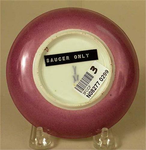The cup with a continuous landscape scene, marked on the underside. Together with a Meissen purple ground saucer, marked on the underside. 3 pieces.