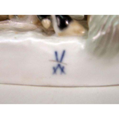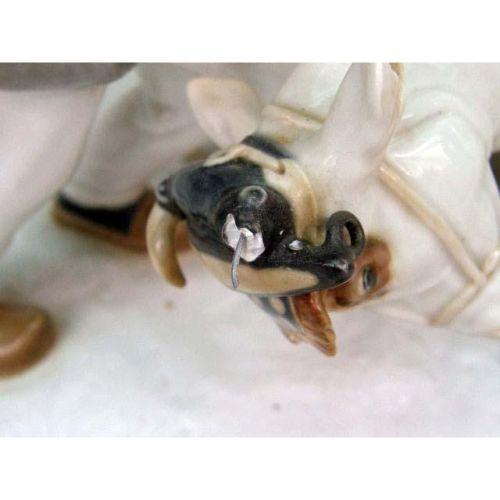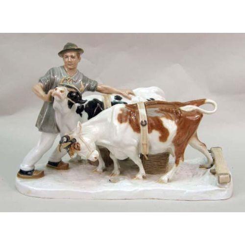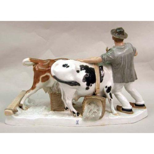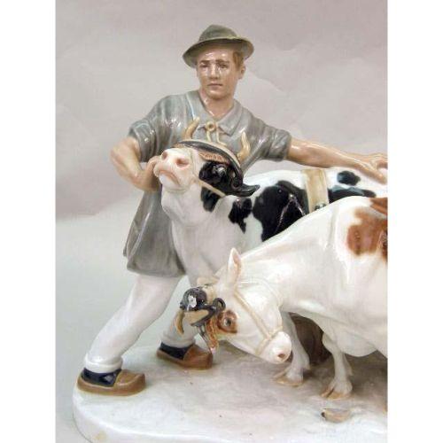 A MEISSEN POLYCHROME-DECORATED PORCELAIN FIGURAL GROUP<BR><BR>Depicting a man with bulls. Losses. 11 3/4"h x 16 1/2"w