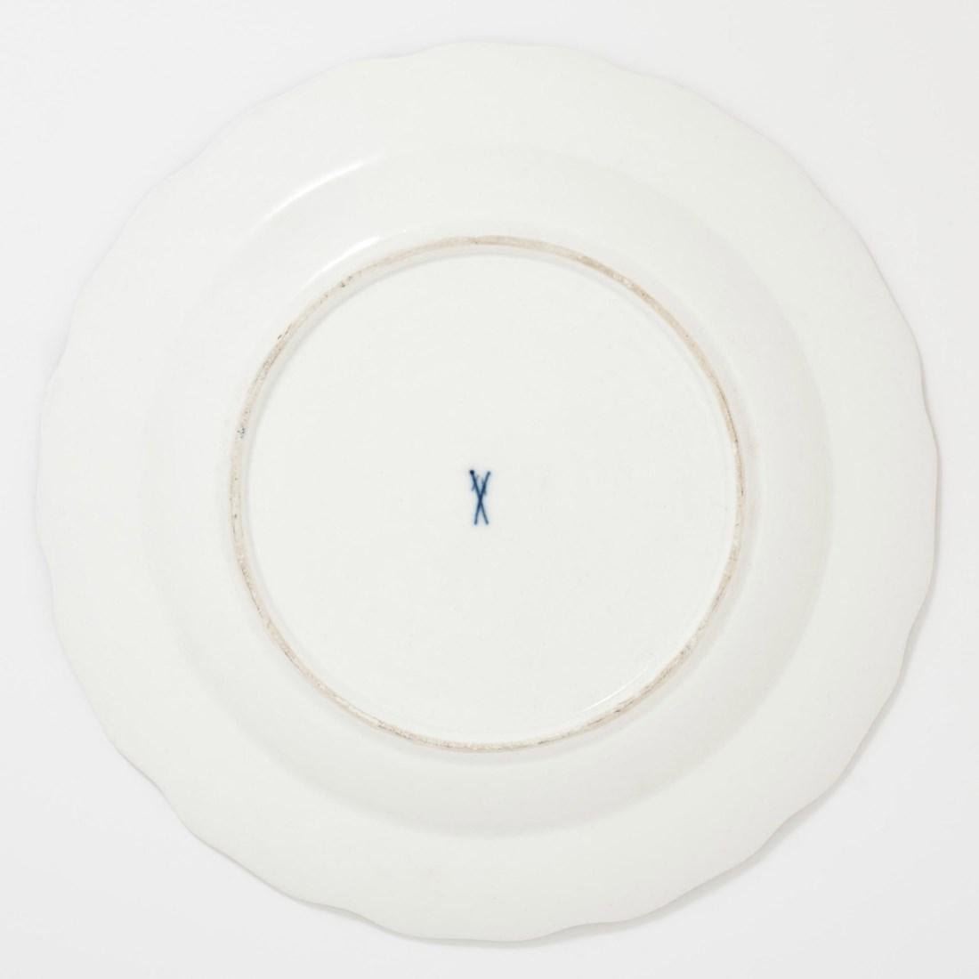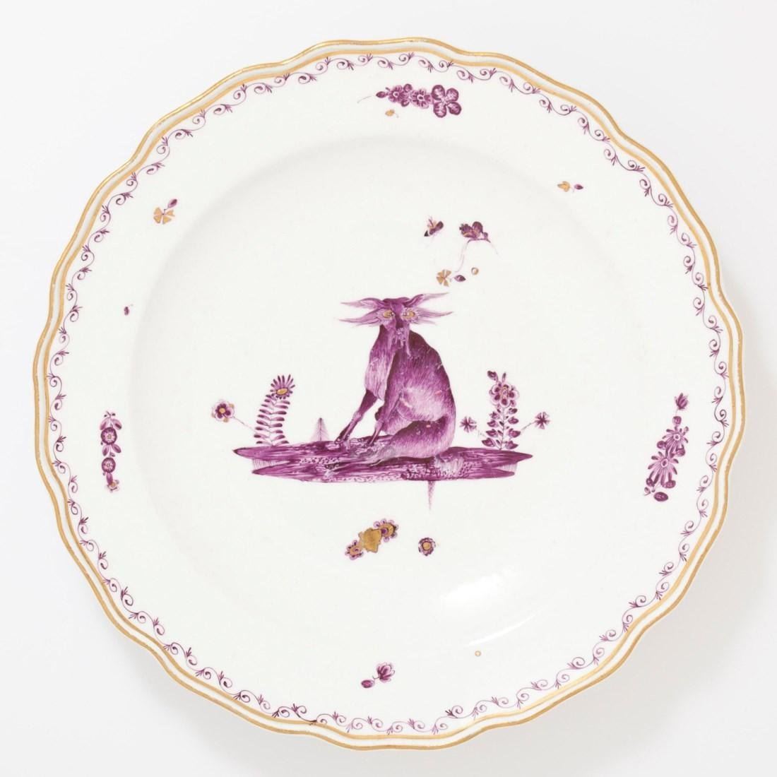 CIRCA 1745, BLUE CROSSED SWORDS MARK AND DREHER'S / MARK. Painted in the manner of Löwenfinck in puce with a mythical beast. 9 1/8 in. (23.2 cm.) diameter.