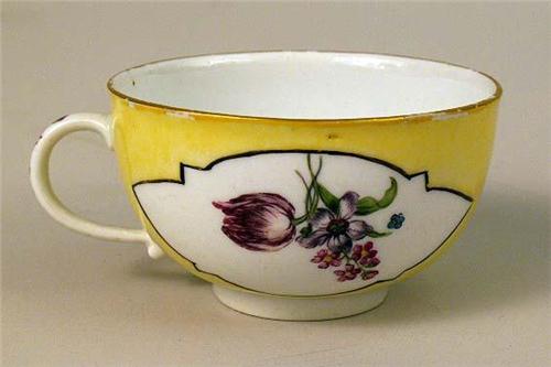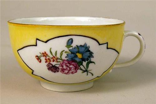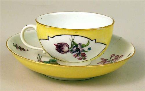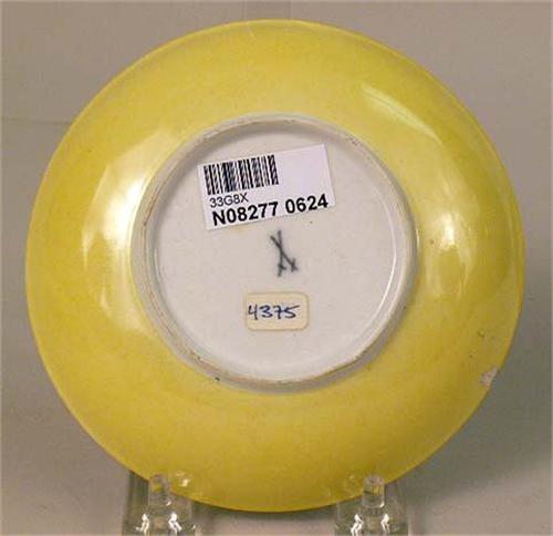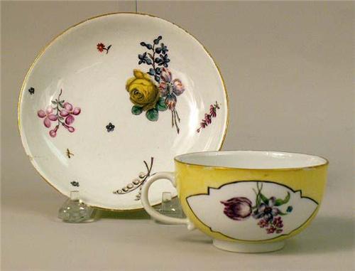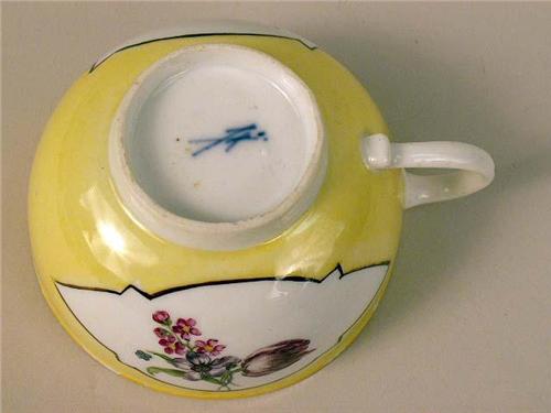 Painted with floral sprays, marked on the underside with crossed swords. Restored rim chip and minor hairline crack to saucer. 5 1/4"dia.
