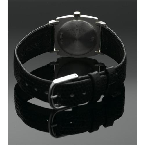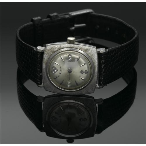 <B>A MEN'S GOLD AND LEATHER WRIST WATCH</B></I><BR>Elgin<BR><BR>The black leather band with 1.1in. diameter 14k white gold square case with white gold hands and dash numerals and eleven (11) diamonds, with original dial signed <I>Elgin,</B></I> marked 14k to reverse.<BR>9in. long<BR>1 <BR><BR><B>Condition Report:</B> In good condition, wear to leather