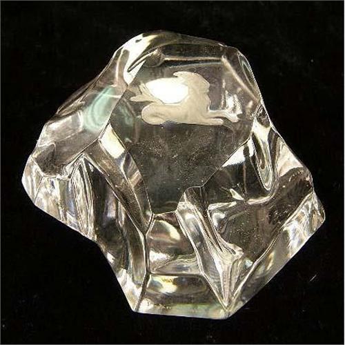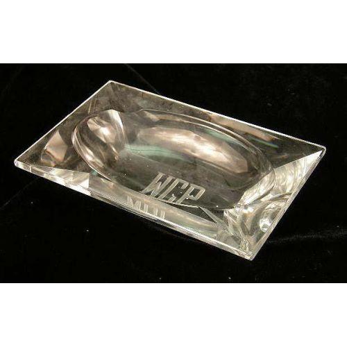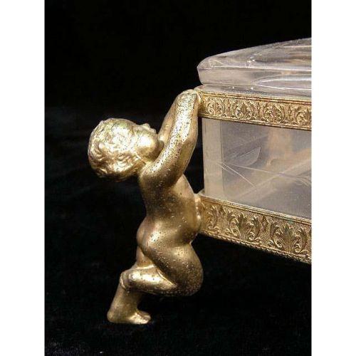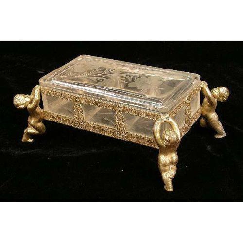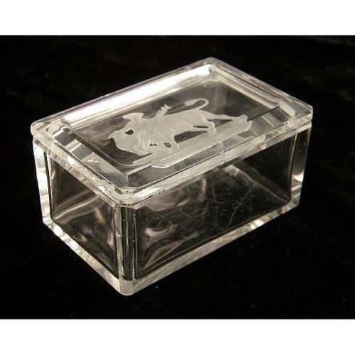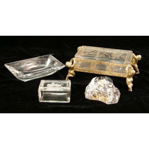 A METAL MOUNTED COLORLESS GLASS COVERED BOX<BR><BR>With cherub feet and etched lid, 3 1/4"h x 8"w x 5"d. Together with a glass ashtray, monogrammed "WCP," a paperweight, and a small covered box with a bull and matador etched lid, wear,