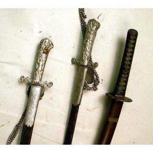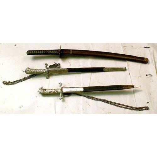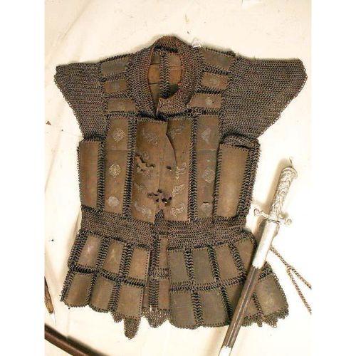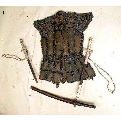 A METAL MOUNTED SUIT OF CHAIN MAIL<BR><BR>Japanese. Together with a brass and silver inlaid shagreen-handled samurai sword and two sheathed daggers. Losses and wear. 4 pieces.