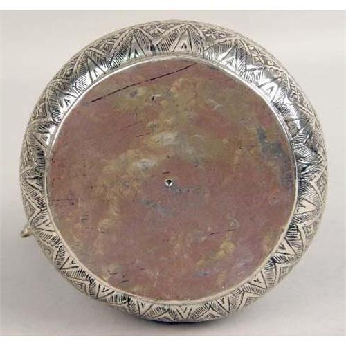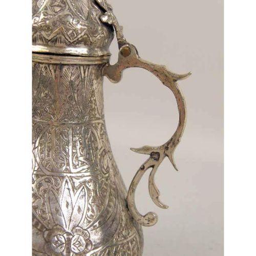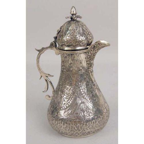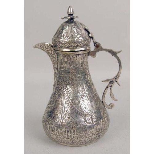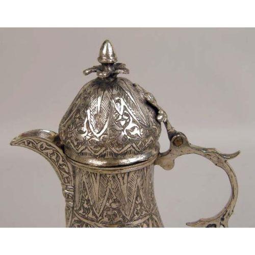 A MIDDLE EASTERN SILVERED METAL COFFEE POT<BR><BR>Baluster form with all-over engraving, 7-1/2"h