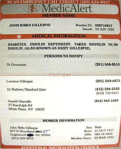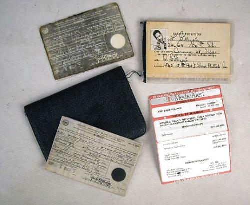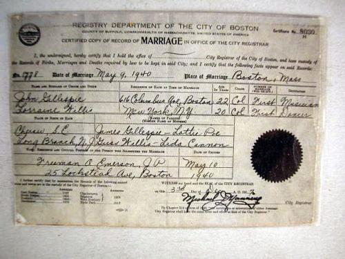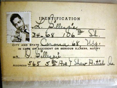 A MINIATURE COPY OF DIZZY AND LORRAINE GILLESPIE'S MARRIAGE LICENSE Dated May 9, 1940, together with an ID card for Lorraine Gillespie with Dizzy Gillespie postage stamp on top, and notification information in case of emergency: "Mr. D. Gillespie, 565 5th Ave., Shav Artist, Inc.