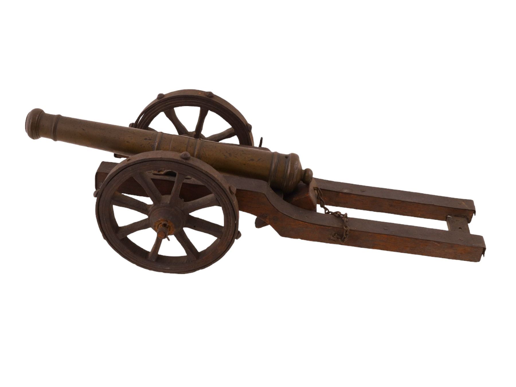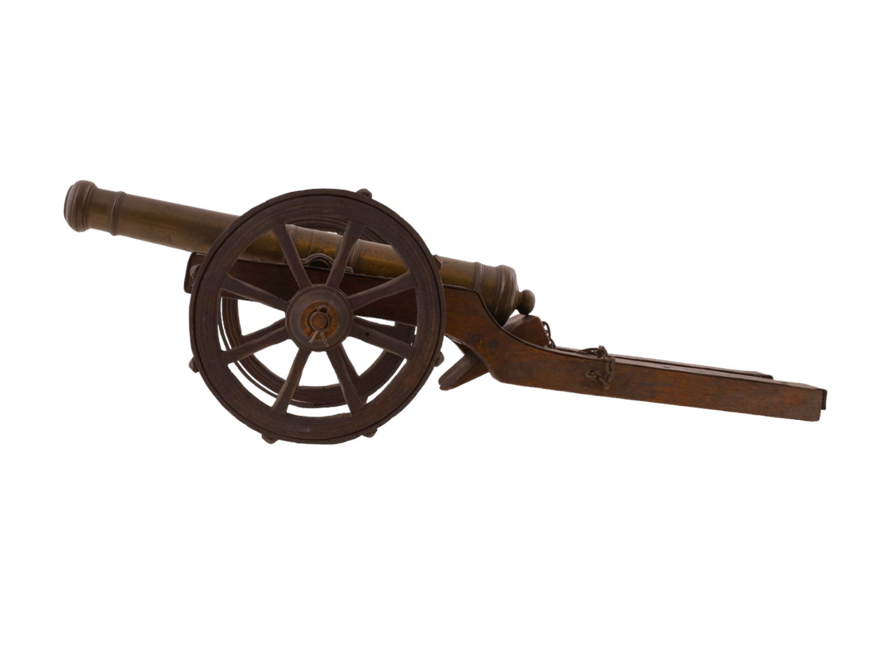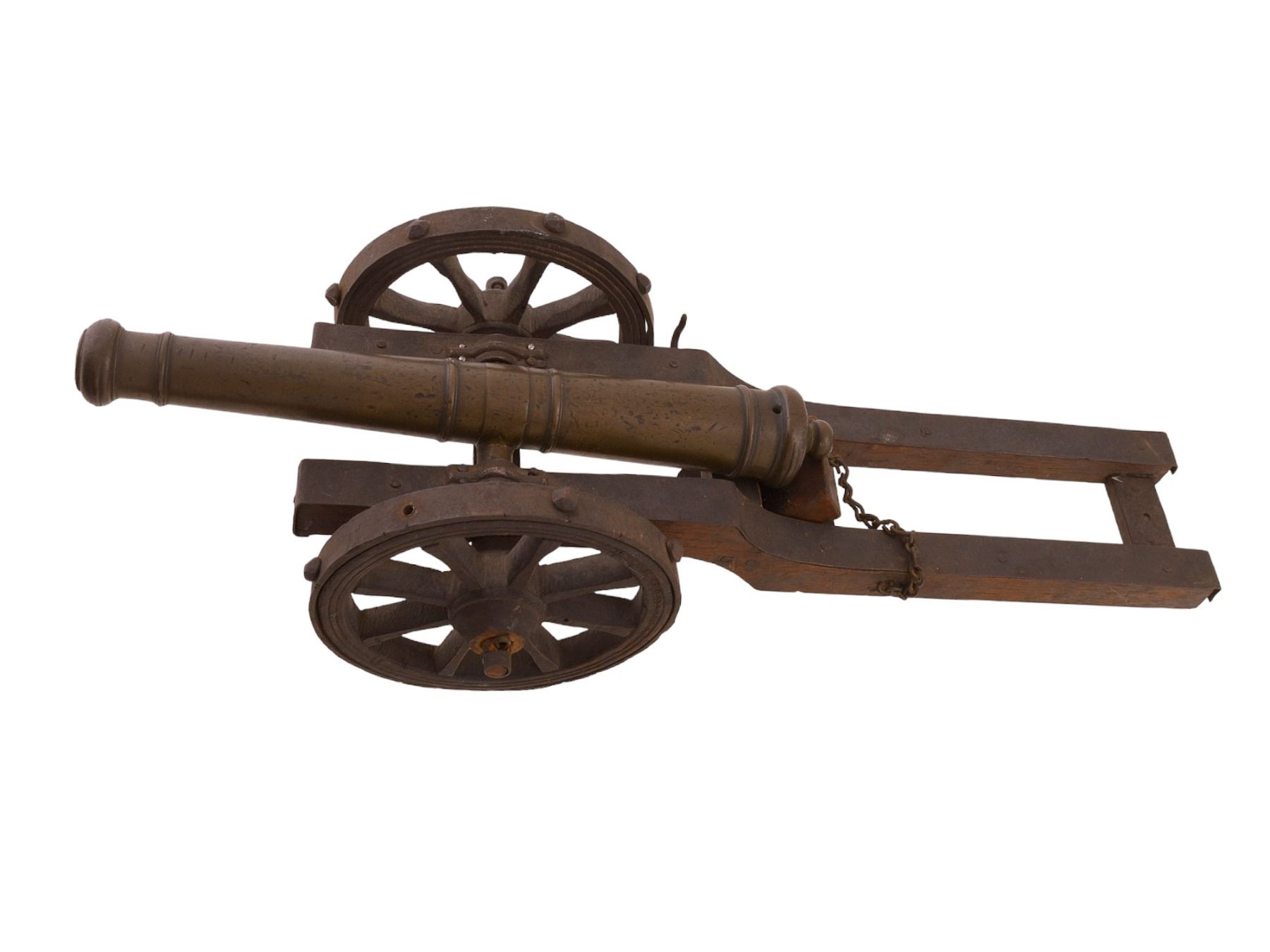 A miniature field cannon in bronze from the 19th century. Includes wooden carriage with reinforced wheels.