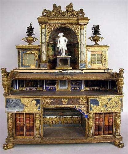 A MINIATURE GILT-METAL MOUNTED CYLINDER FRONT DESK; Elaborately decorated, 16"h x 13"w losses