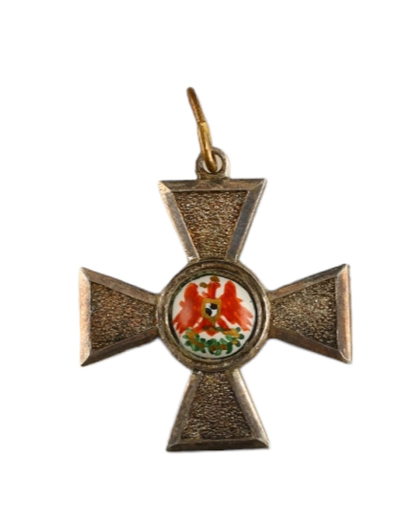 A pre-1918 miniature version of a Prussian Kingdom 4th Class 'Order of the Red Eagle' medal. The medal consists of a cross stippled on both sides, while the face has a circular enamel medallion in the center depicting the Brandenburg crowned red eagle with the Hohenzollern arms, being a quartered black and white shield, on its breast. The reverse shows the crowned cipher of King Friedrich Wilhelm III