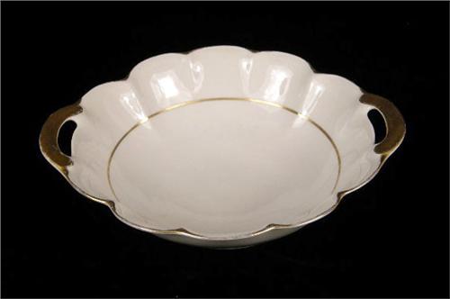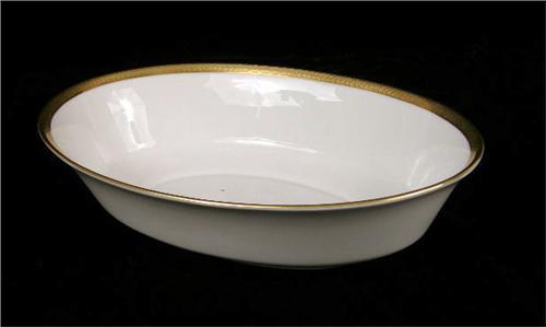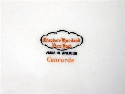 Including twelve dinner plates, twenty four salad plates, twelve each saucers, small bowls and tea cups. Together with a Theodore Haviland partial dinner service in the "Concorde" pattern, including eight dinner plates, three salad plates, seven dessert plates, five shallow bowls, eight bread plates, seven large saucers, eight small saucers, four tea cups, seven demitasse cups, one gravy boat, creamer and sugar, one oval platter, and a two-handled bowl. Approximately 149 pieces. Haviland with wear to gold rim, chips.