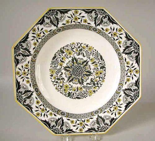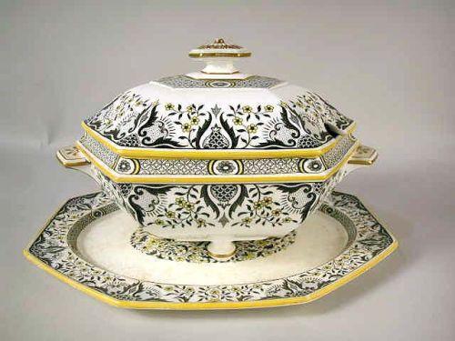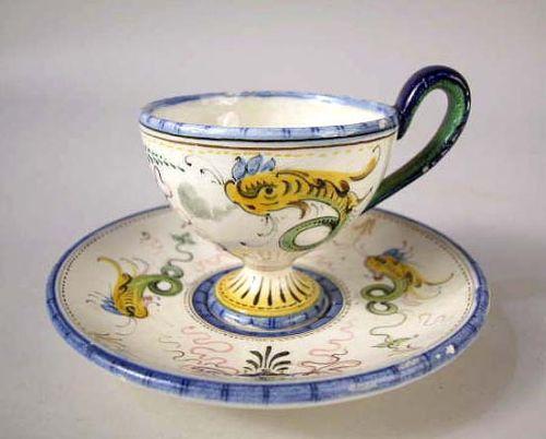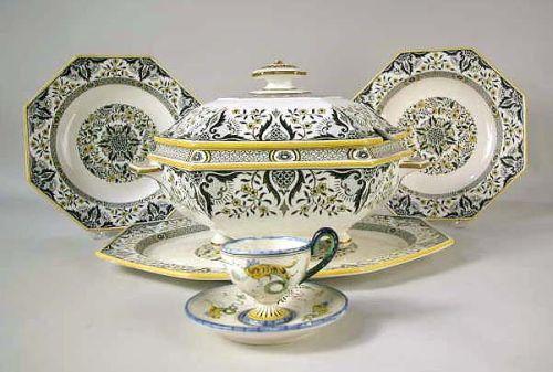 Stamped and incised Mintons. Ladle broken, rim chips, staining. Tureen 13 1/2"l. Together with a footed cup and two saucers, polychrome decorated, made in Italy. Chips. 4 3/4".