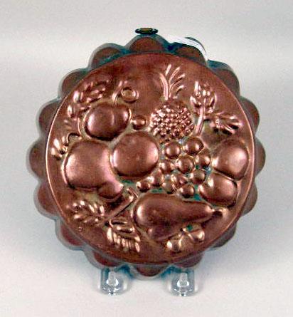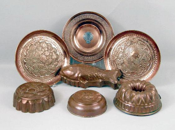Comprising a fish-form mold, three cake molds, a double-handled sauce pan, two circular trays, and a dinner plates. 8 pieces.