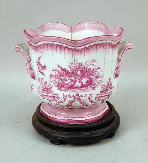 Comprising two 19th century cache pots, an owl-shaped jug, a green leaf-decorated vase signed "Jean Roger Paris/Made in France", three contemporary hippopotamus-decorated lidless nesting canisters, a lion-head planter, a Thai red-and-black-lacquer planter surround, a stamped tin planter and 4 hand-painted thick clay tiles. 14 pieces. Lion-head planter with a 6" very tight hairline crack, wear to one hippo canister and owl jug, crack to pink cache pot.