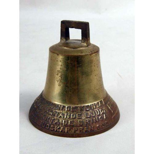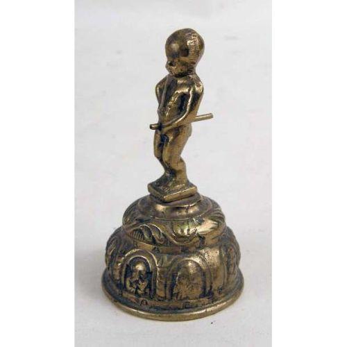 A MISCELLANEOUS GROUP OF BELLS<BR><BR>comprising a carved wooden elephant bell, a long-handled Shaman bell, a contemporary copper bell/windchime, a figural bell depicting a young boy, a small Swiss cowbell, and a brass Christmas bell from Denmark or Sweden. Heights from 5" - 23". 6 pieces.